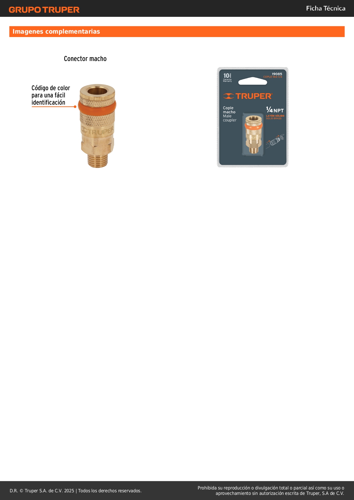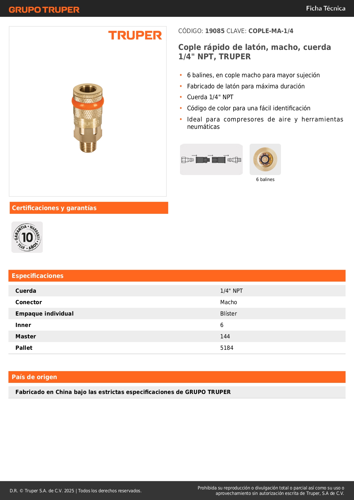 Acople de latón, cuerda 1/4 npt, macho, truper