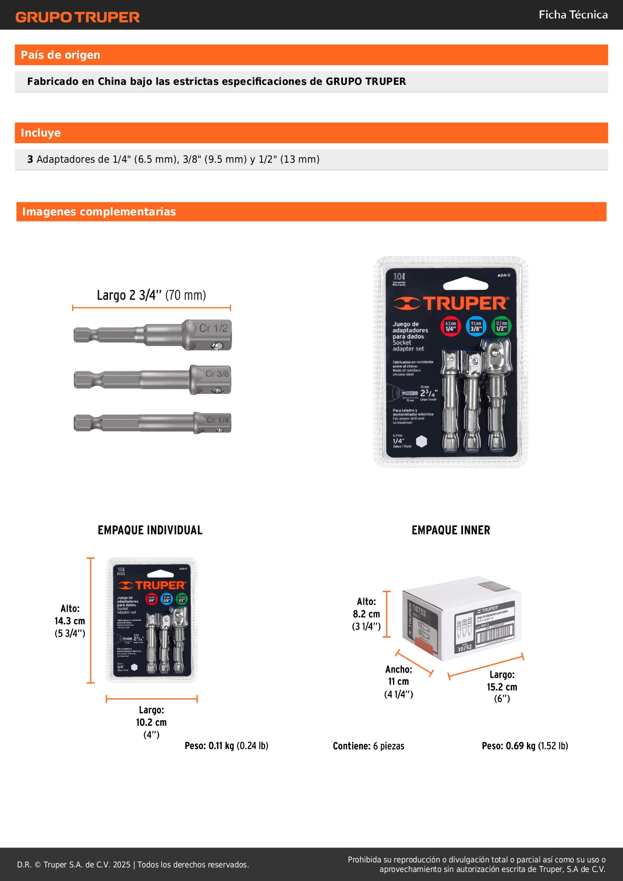 3 Adaptadores de 1/4" (6.5 mm), 3/8" (9.5 mm) y 1/2" (13 mm)