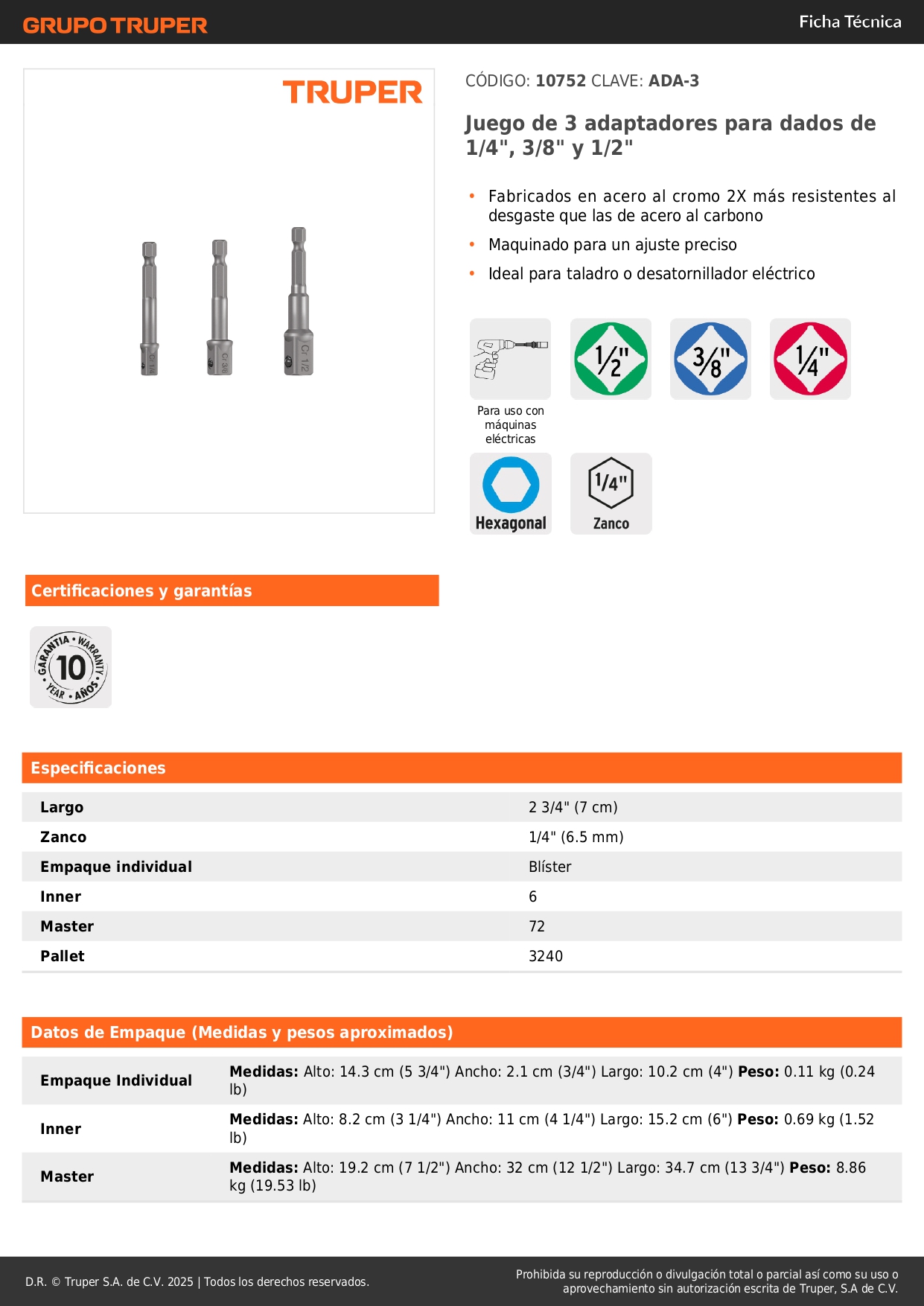 Adaptadores para dados taladro atornillador 3 pzas 1/4", 3/8" y 1/2" truper