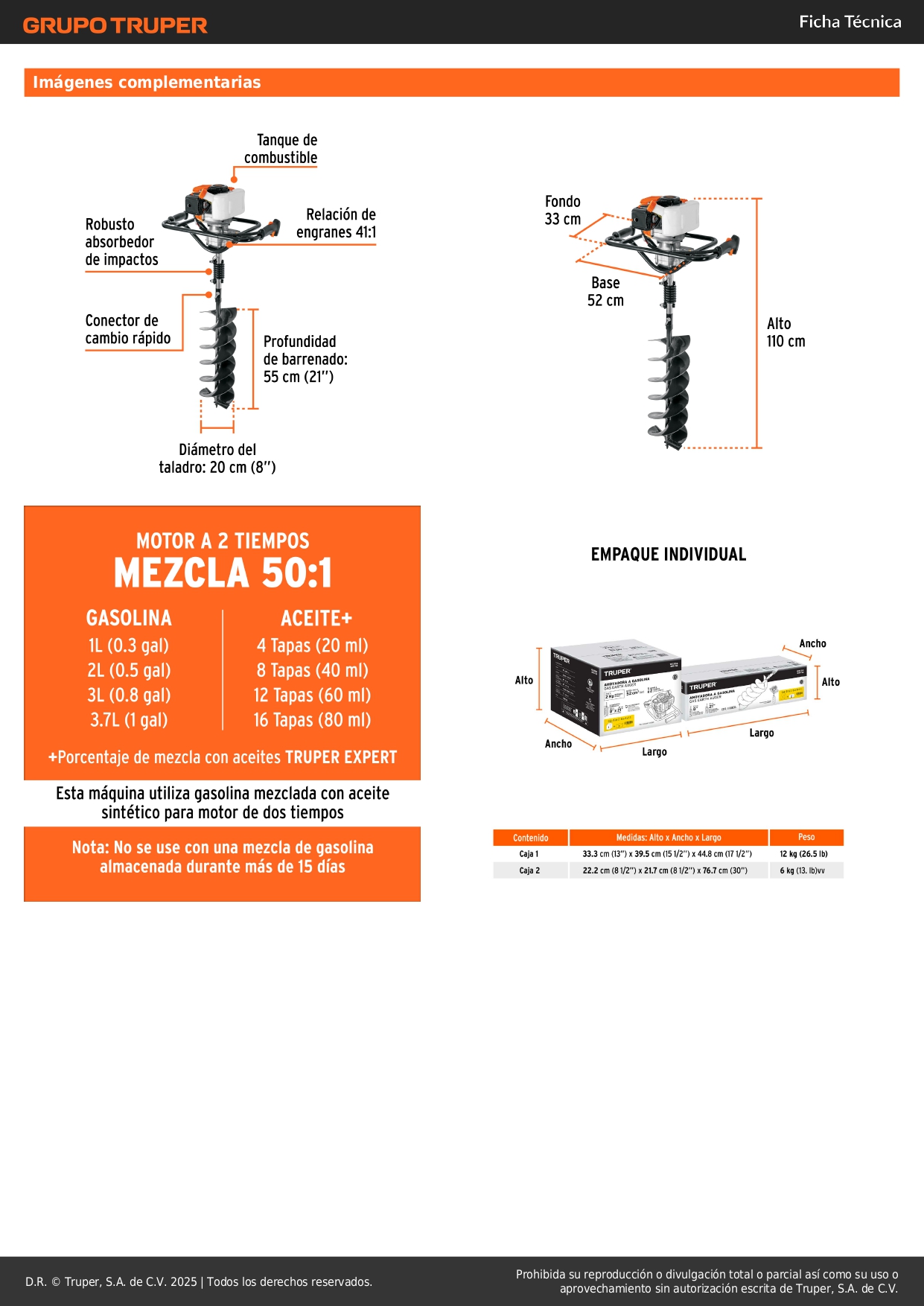 • Motor de 1.9 HP a 2 tiempos, requiere mezcla de aceite y gasolina