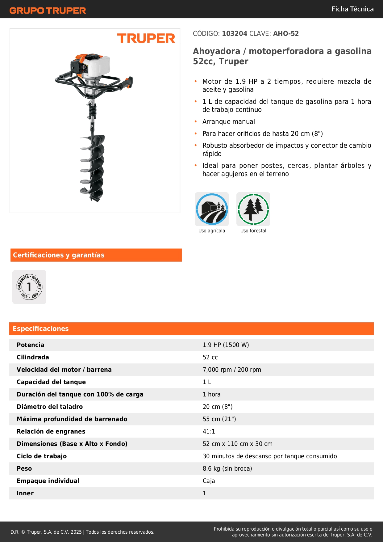 • Ideal para poner postes, cercas, plantar árboles y hacer agujeros en el terreno