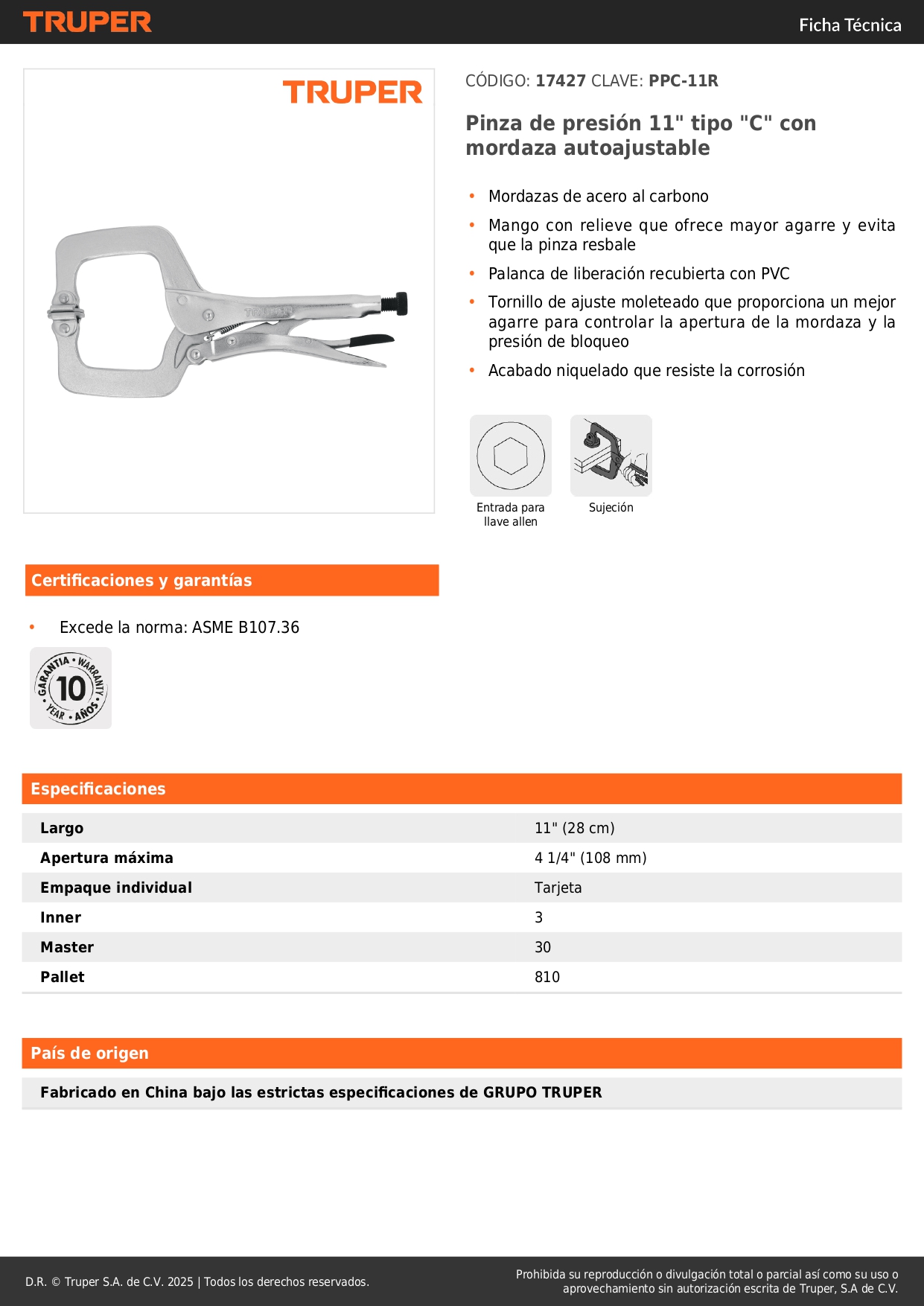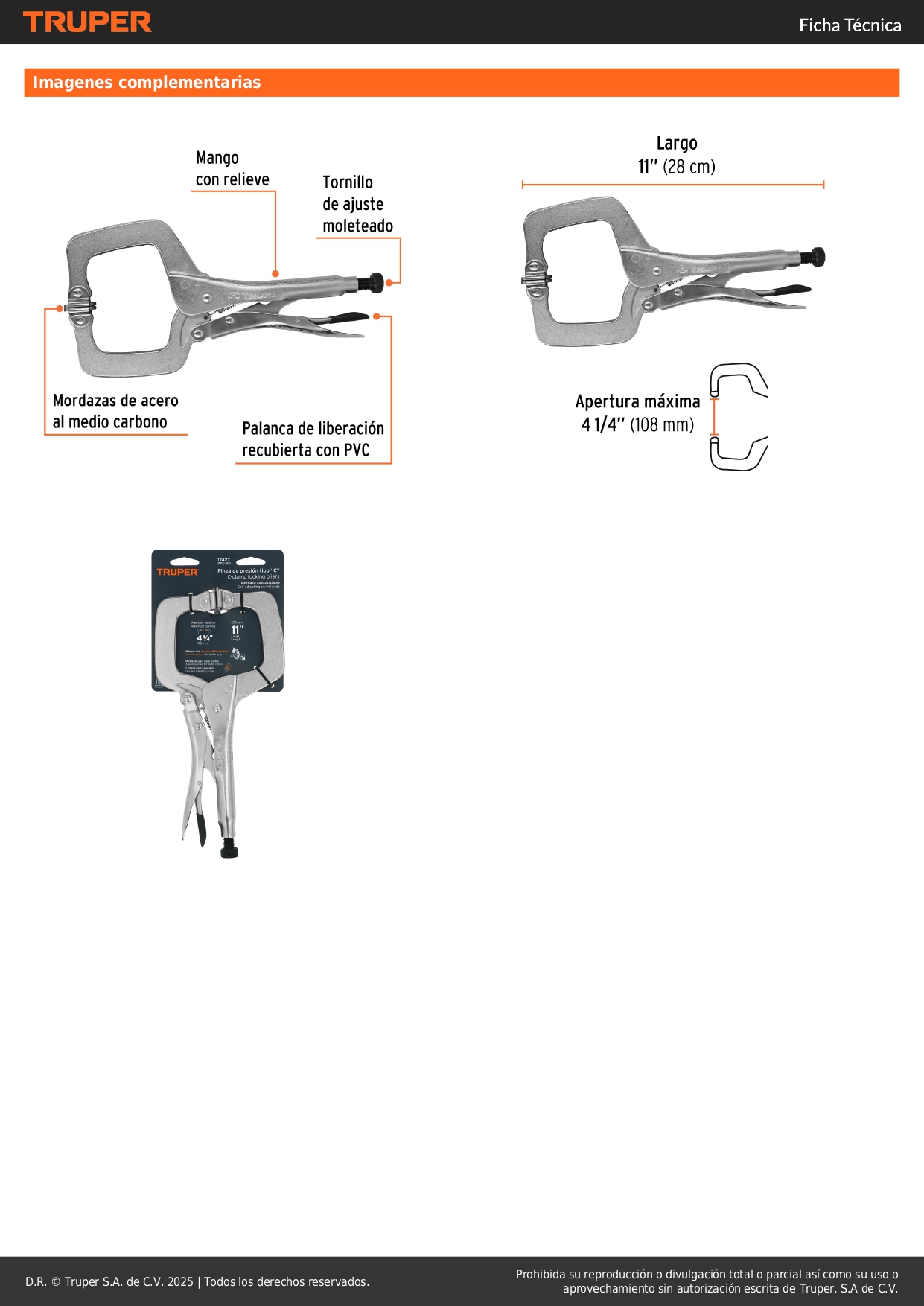 Alicate de presión 11'' tipo ''c'' con mordaza autoajustable truper