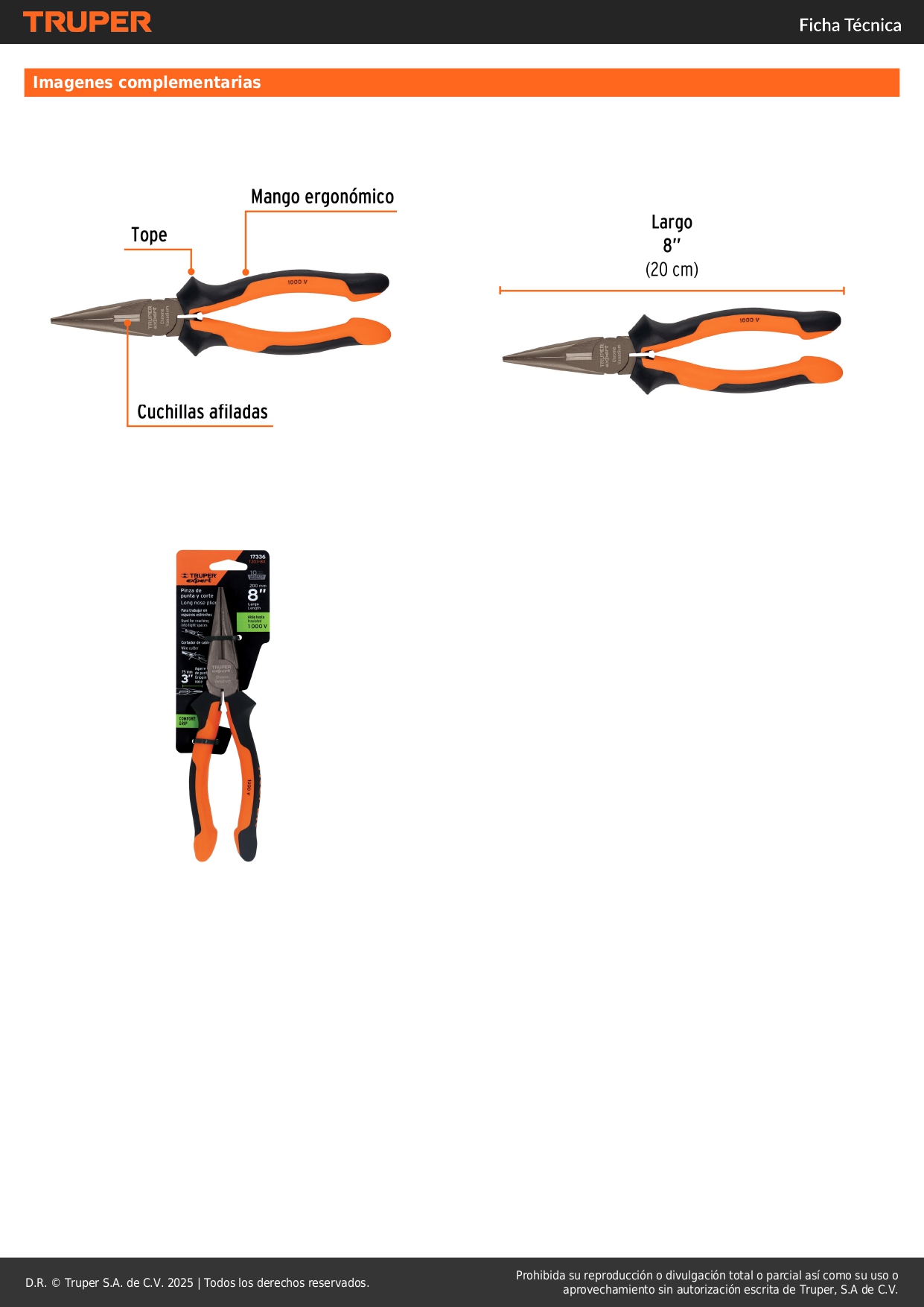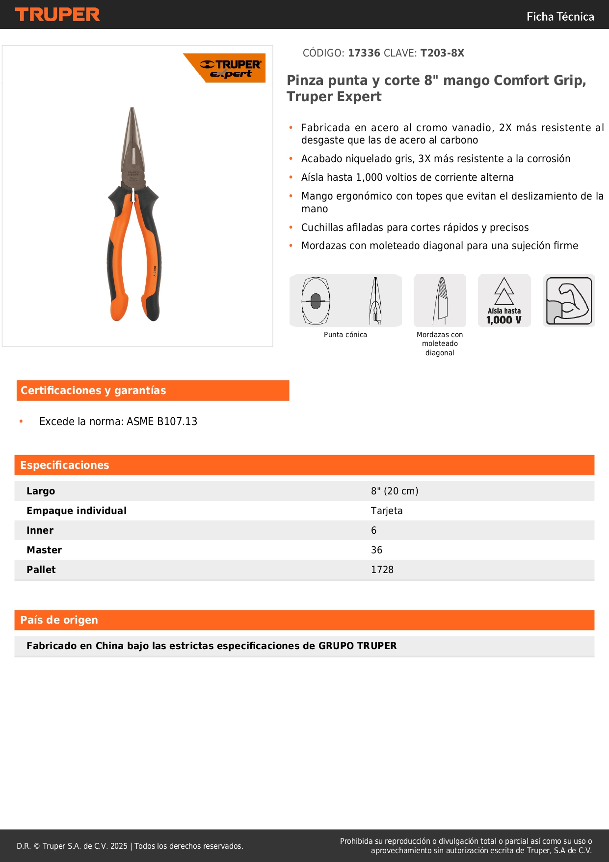 Alicate de punta y corte 8'' mango comfort grip. truper expert