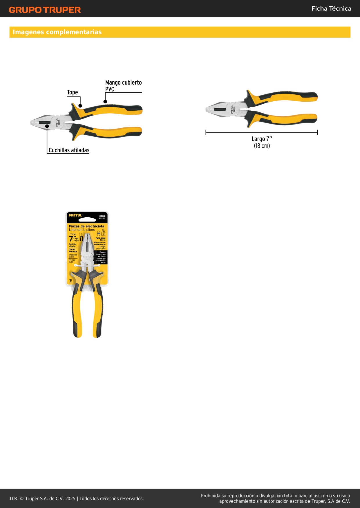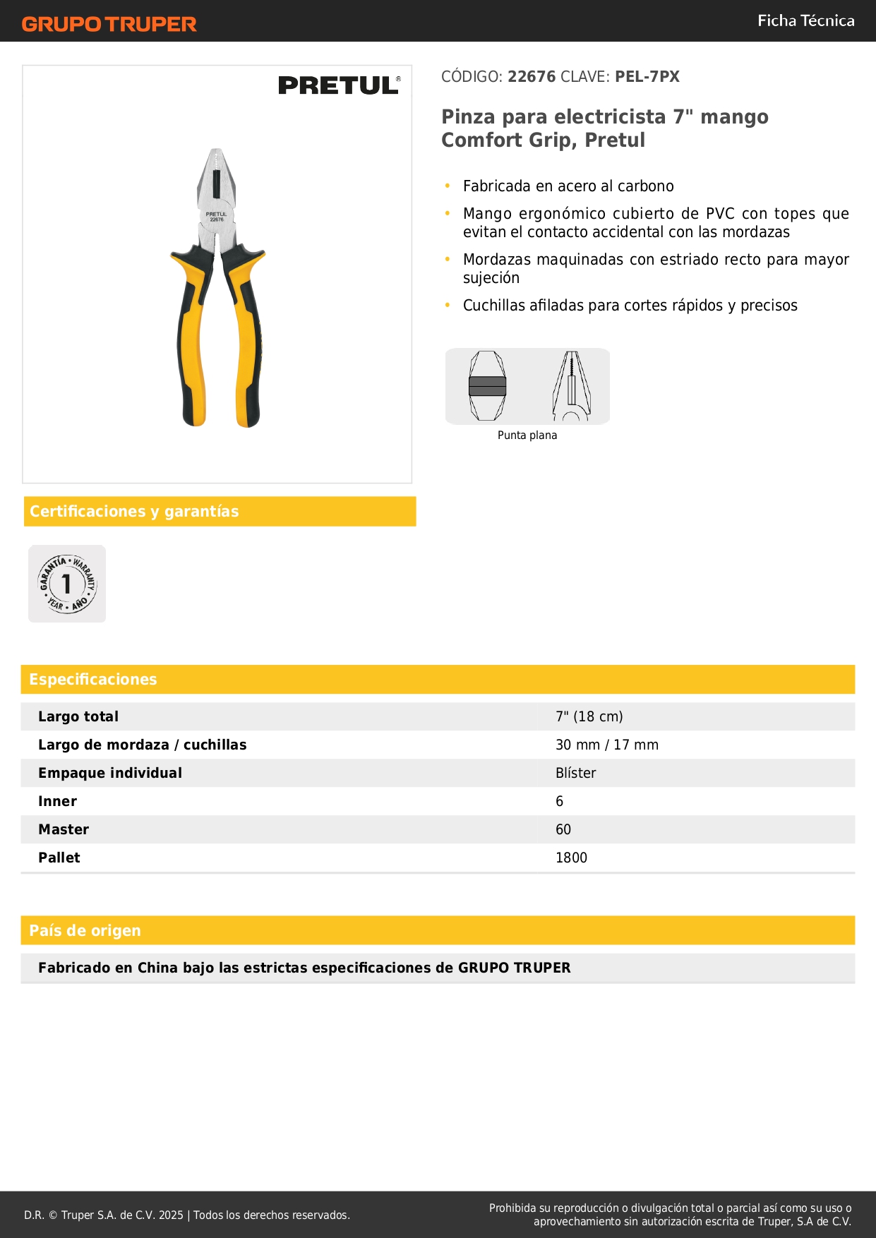 Pinza para electricista 7" mango Comfort Grip, Pretul