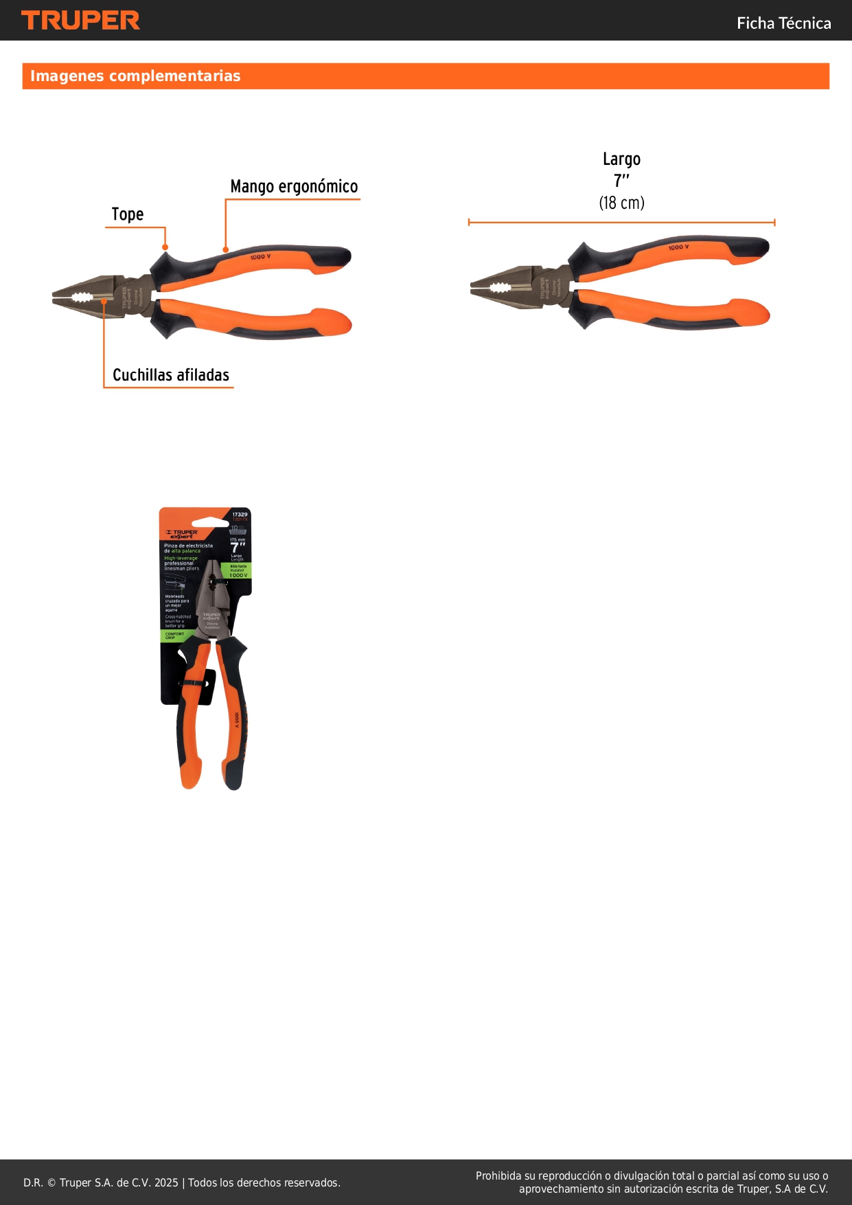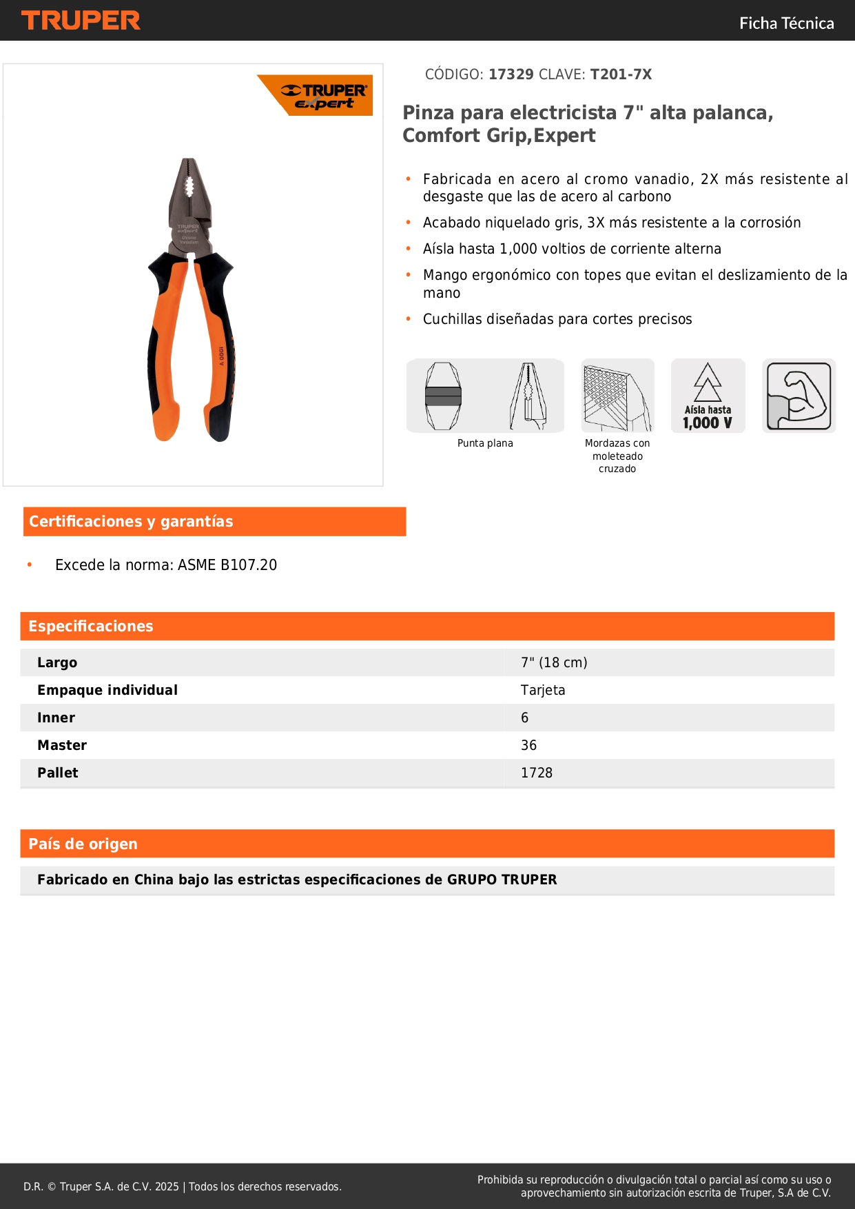 Alicate universal 7'' mango comfort grip. truper expert