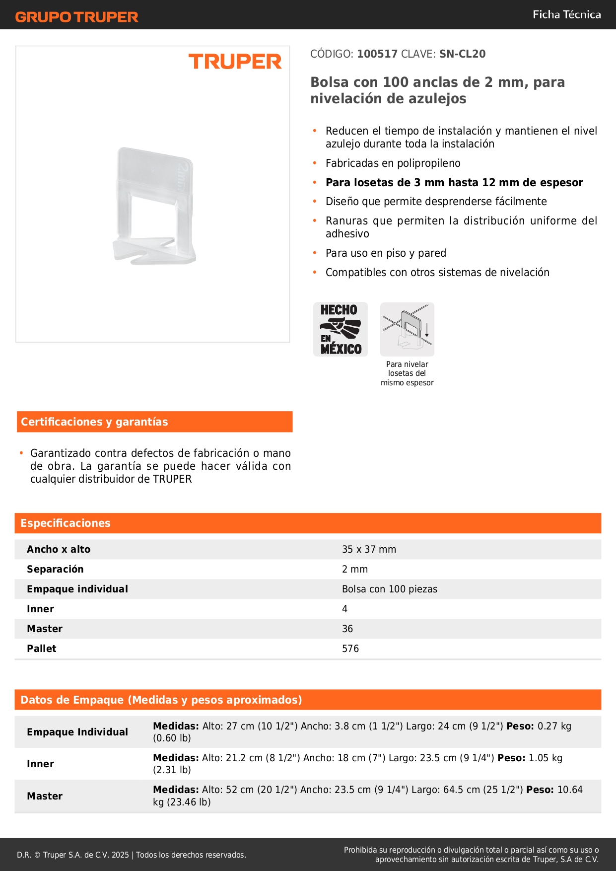 Anclas rectas para nivelacion de mayolica 100 unidades truper