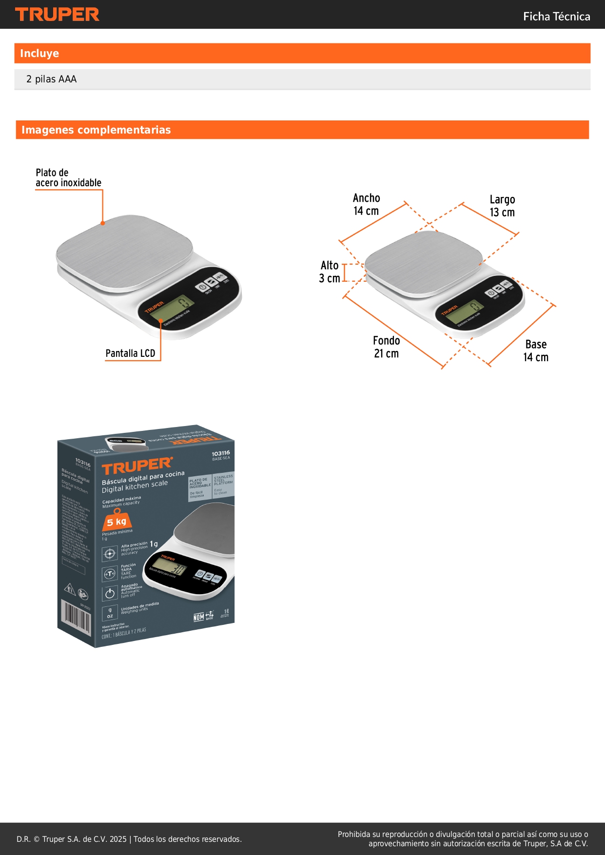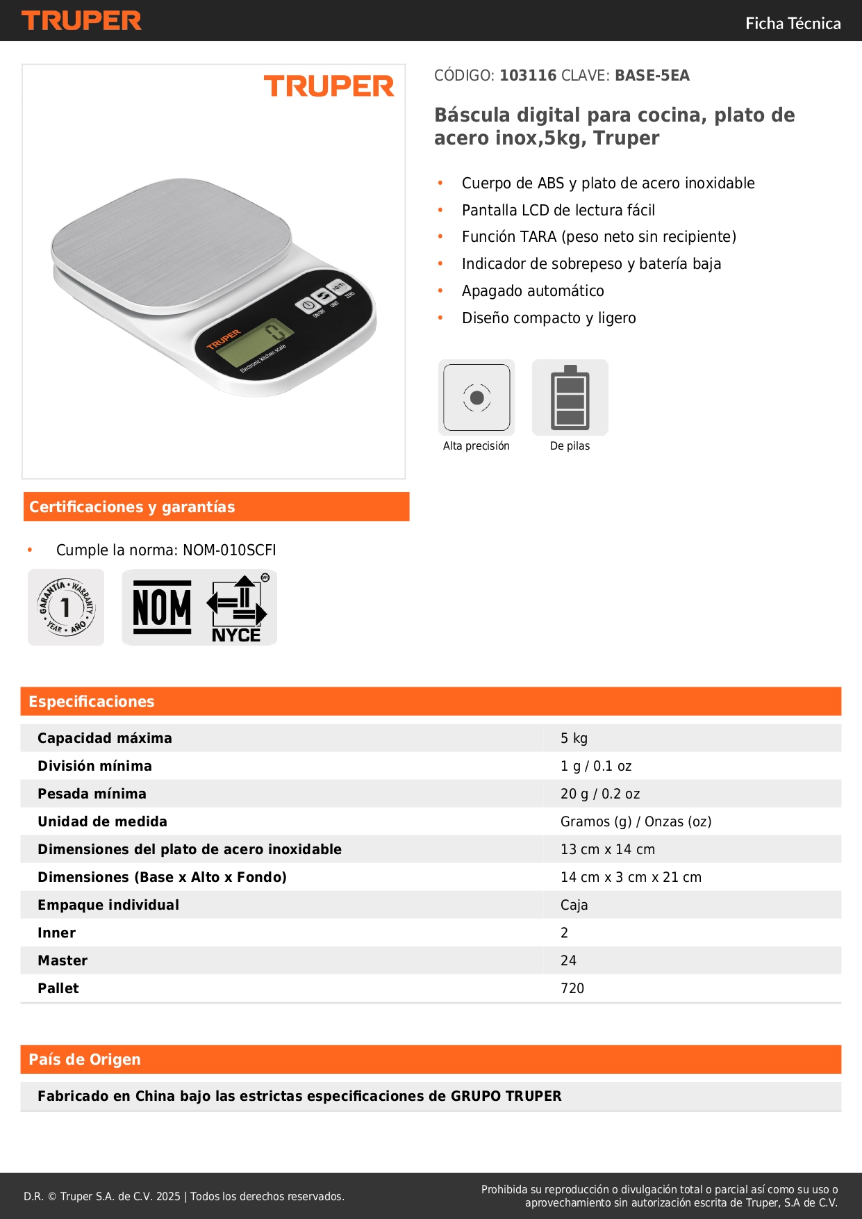 Báscula digital para cocina, plato de acero inox,5kg, Truper