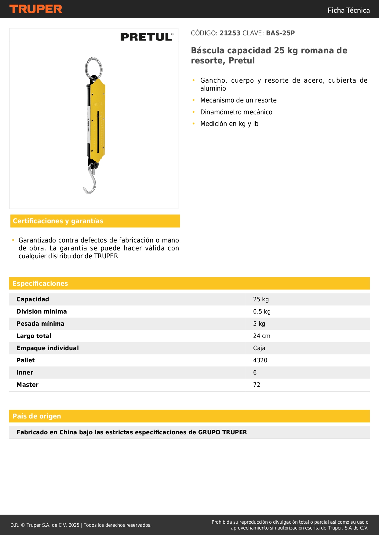 Balanza romana de resorte, capacidad 25 kg, pretul S/ 7.90 Agregar al carro Avísame cuando llegue -Gancho, cuerpo y resorte de acero, cubierta de aluminio-Mecanismo de un resorte-Dinamómetro mecánico-Medición en kg y lb