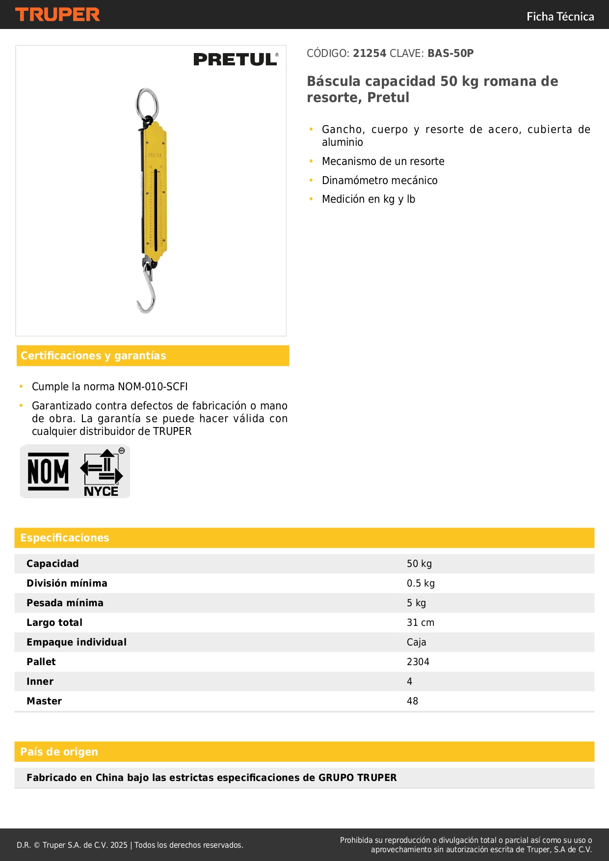 Balanza romana de resorte capacidad 50 kg pretul S/ 10.00 Agregar al carro Avísame cuando llegue -Gancho, cuerpo y resorte de acero, cubierta de aluminio-Mecanismo de un resorte-Dinamómetro mecánico-Medición en kg y lb