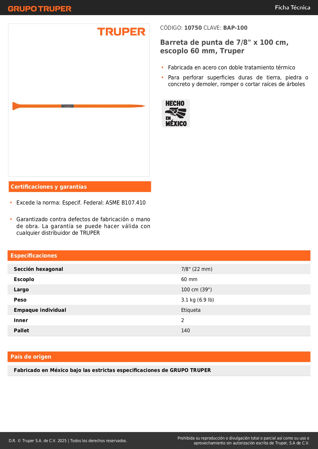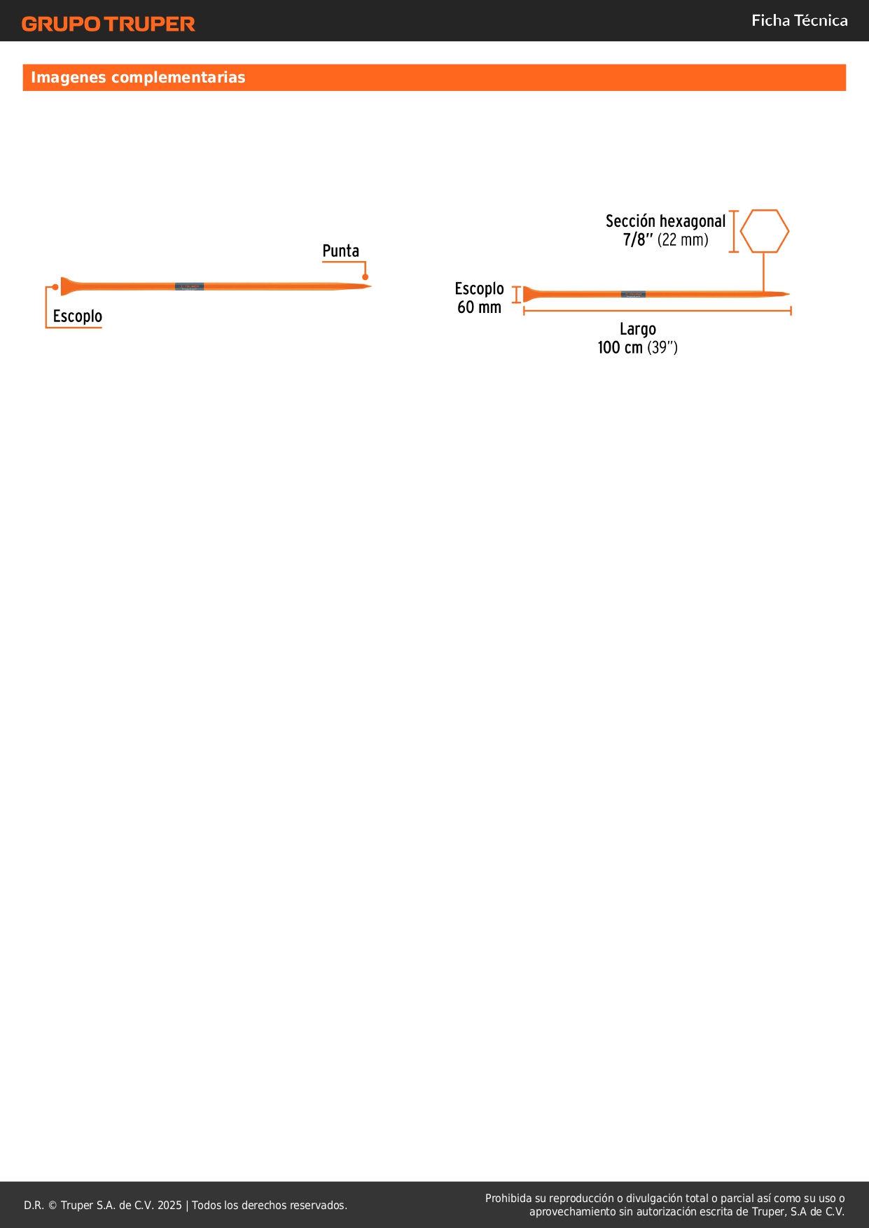 Barreta de punta de 7/8´´ x 100 cm, escoplo 60 mm, truper S/ 46.50 Agregar al carro Avísame cuando llegue -Fabricada en acero con doble tratamiento térmico-Para perforar superficies duras de tierra, piedra o concreto y demoler, romper o cortar raíces de árboles