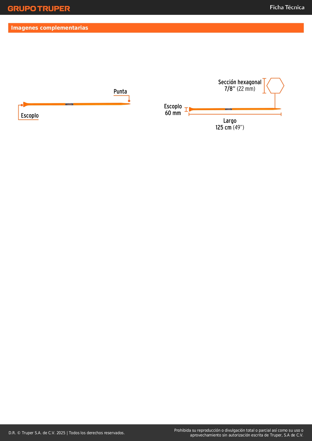 Barreta de punta de 7/8´´ x 125 cm, escoplo 60 mm, truper S/ 56.00 Agregar al carro Avísame cuando llegue -Fabricada en acero con doble tratamiento térmico-Para perforar superficies duras de tierra, piedra o concreto y demoler, romper o cortar raíces de árboles