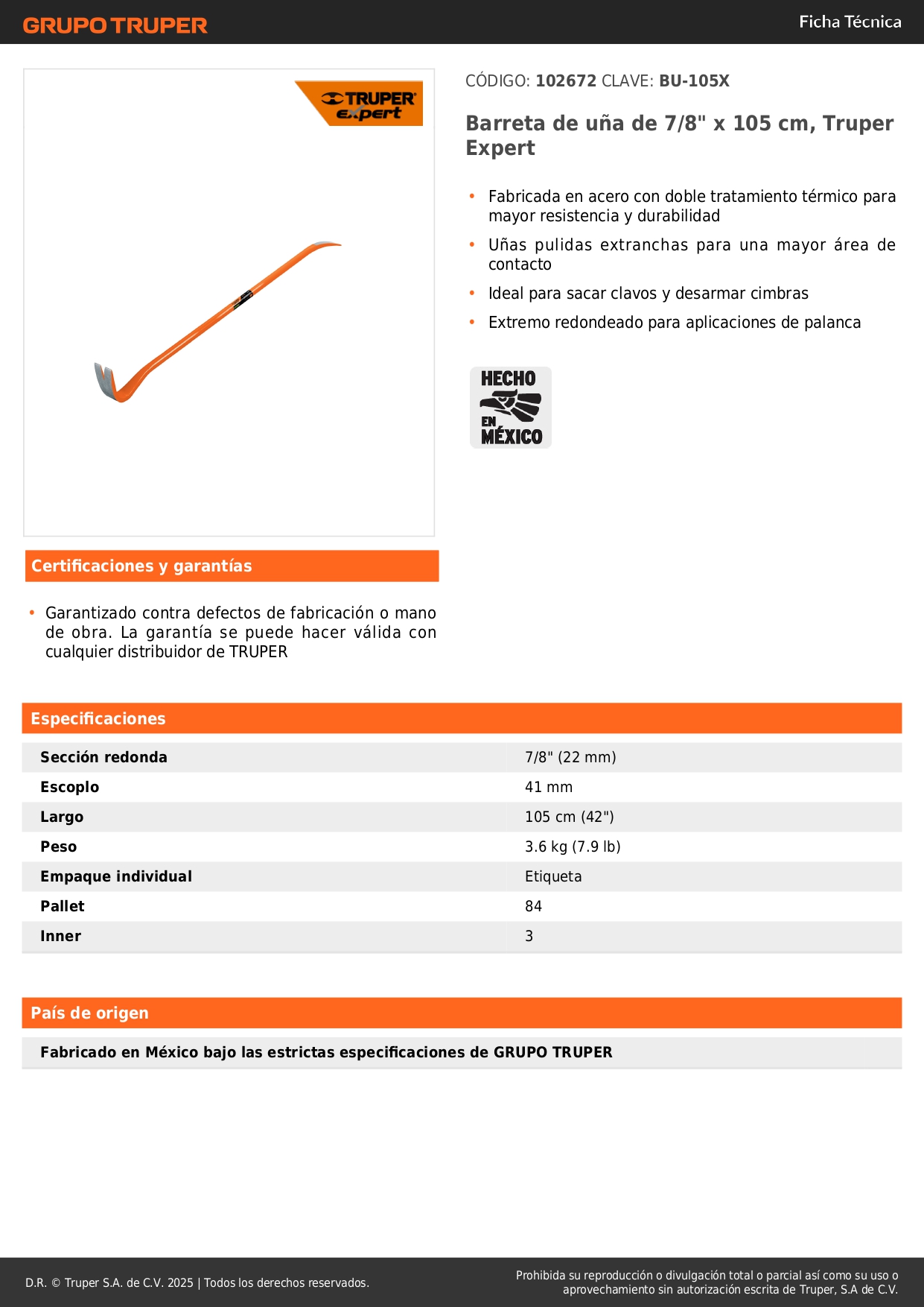 Barreta de uña de 7/8" x 105 cm, truper expert