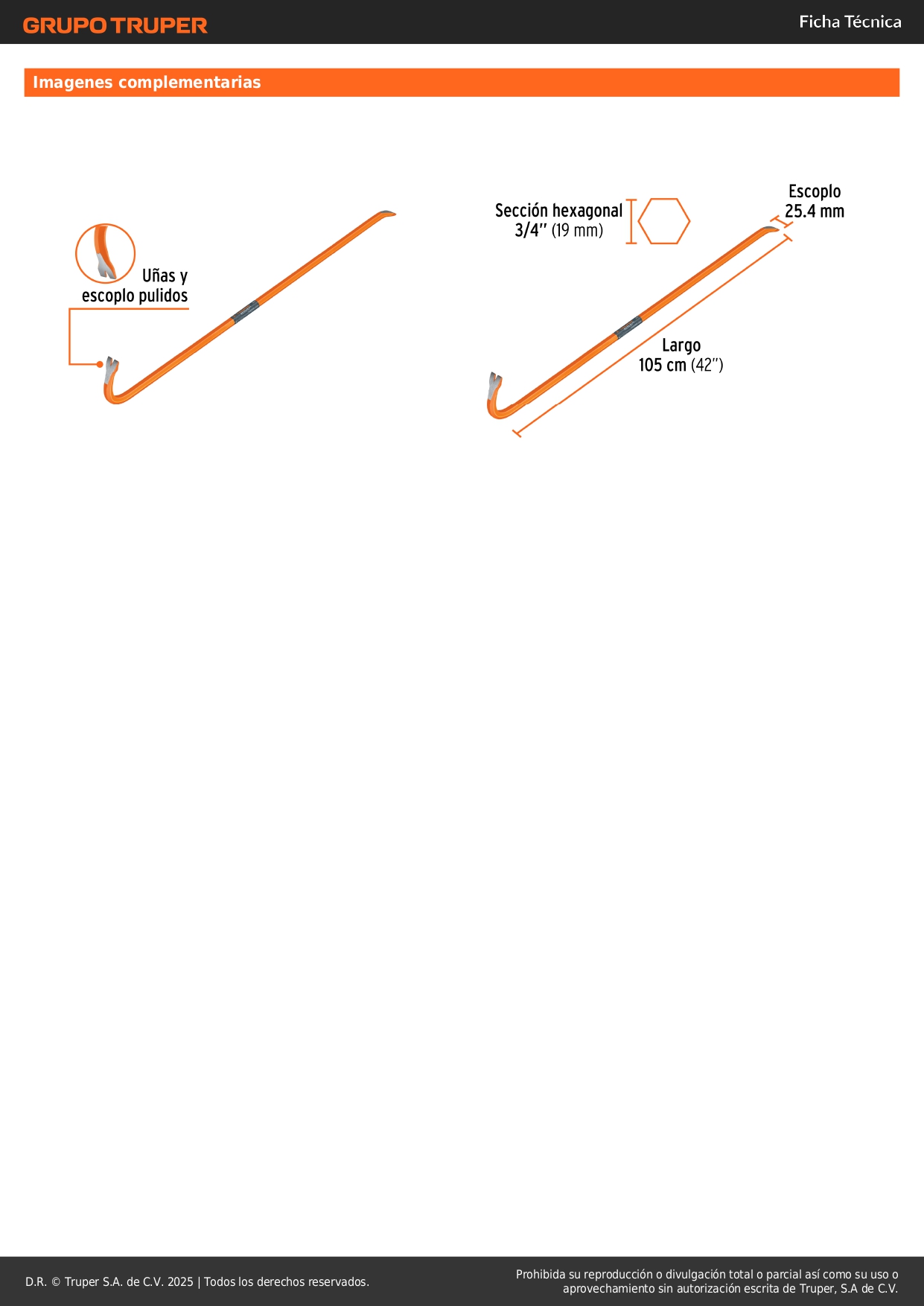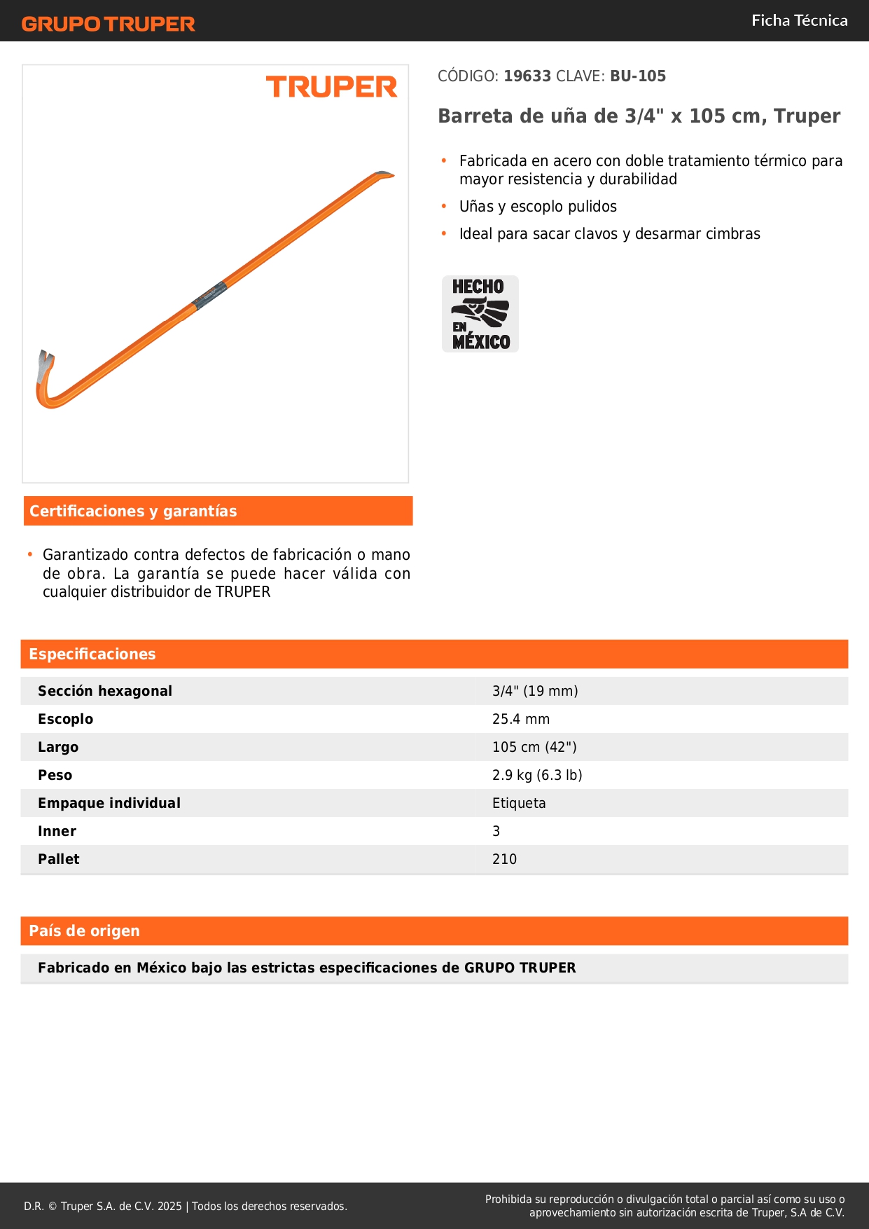 Barreta pata de cabra de 3/4'' x 107 cm truper S/ 39.50 Agregar al carro Avísame cuando llegue -Fabricada en acero con doble tratamiento térmico para mayor resistencia y durabilidad-Uñas y escoplo pulidos-Ideal para sacar clavos y desarmar cimbras