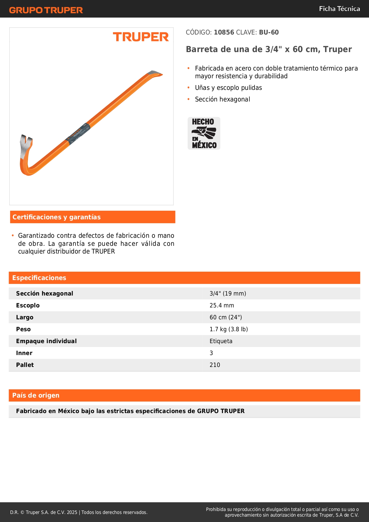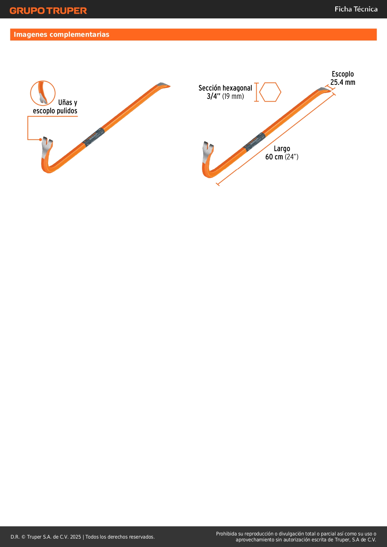 Barreta pata de cabra de 3/4'' x 60 cm truper S/ 27.00 Agregar al carro Avísame cuando llegue -Fabricada en acero con doble tratamiento térmico para mayor resistencia y durabilidad-Uñas y escoplo pulidas-Sección hexagonal