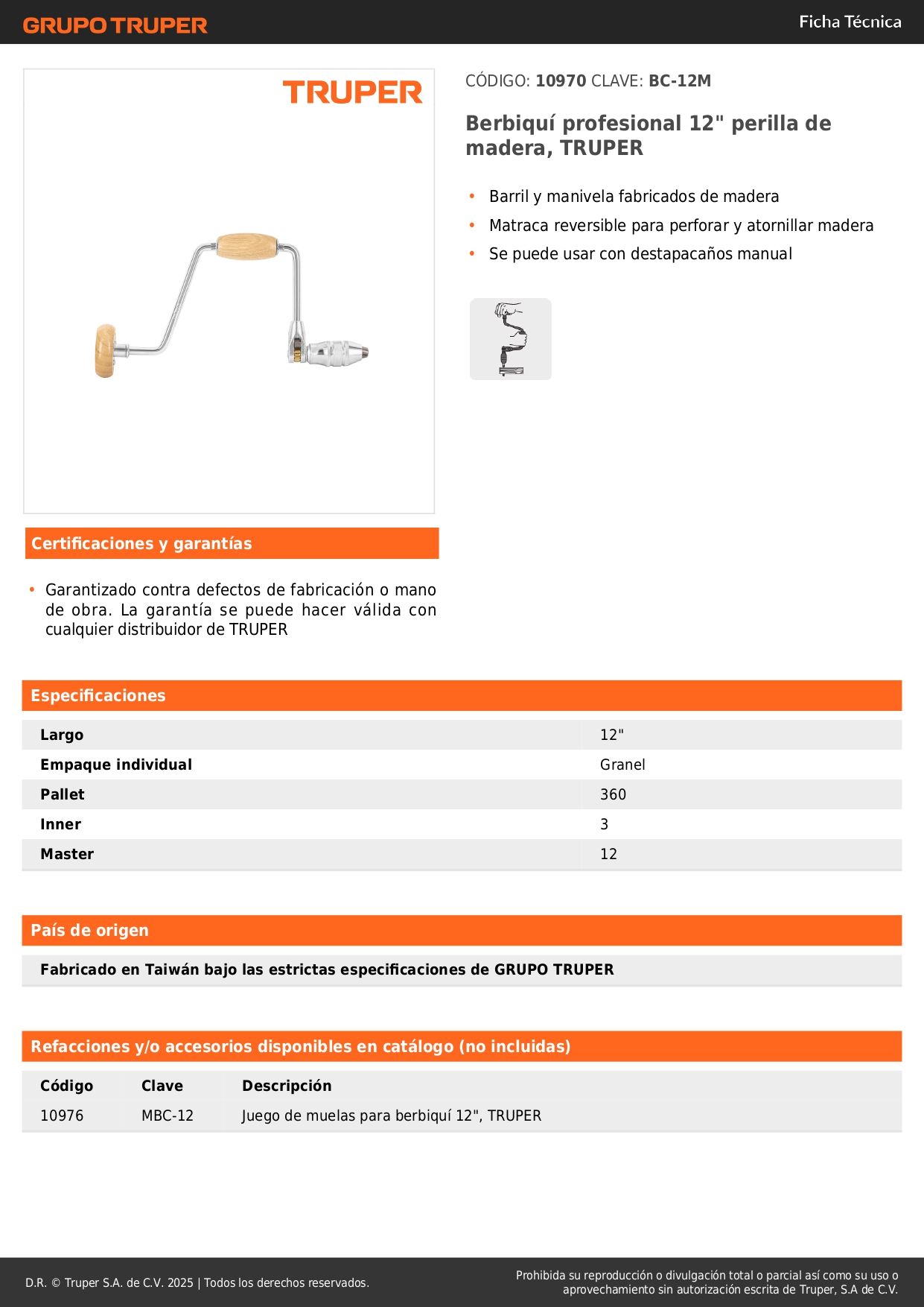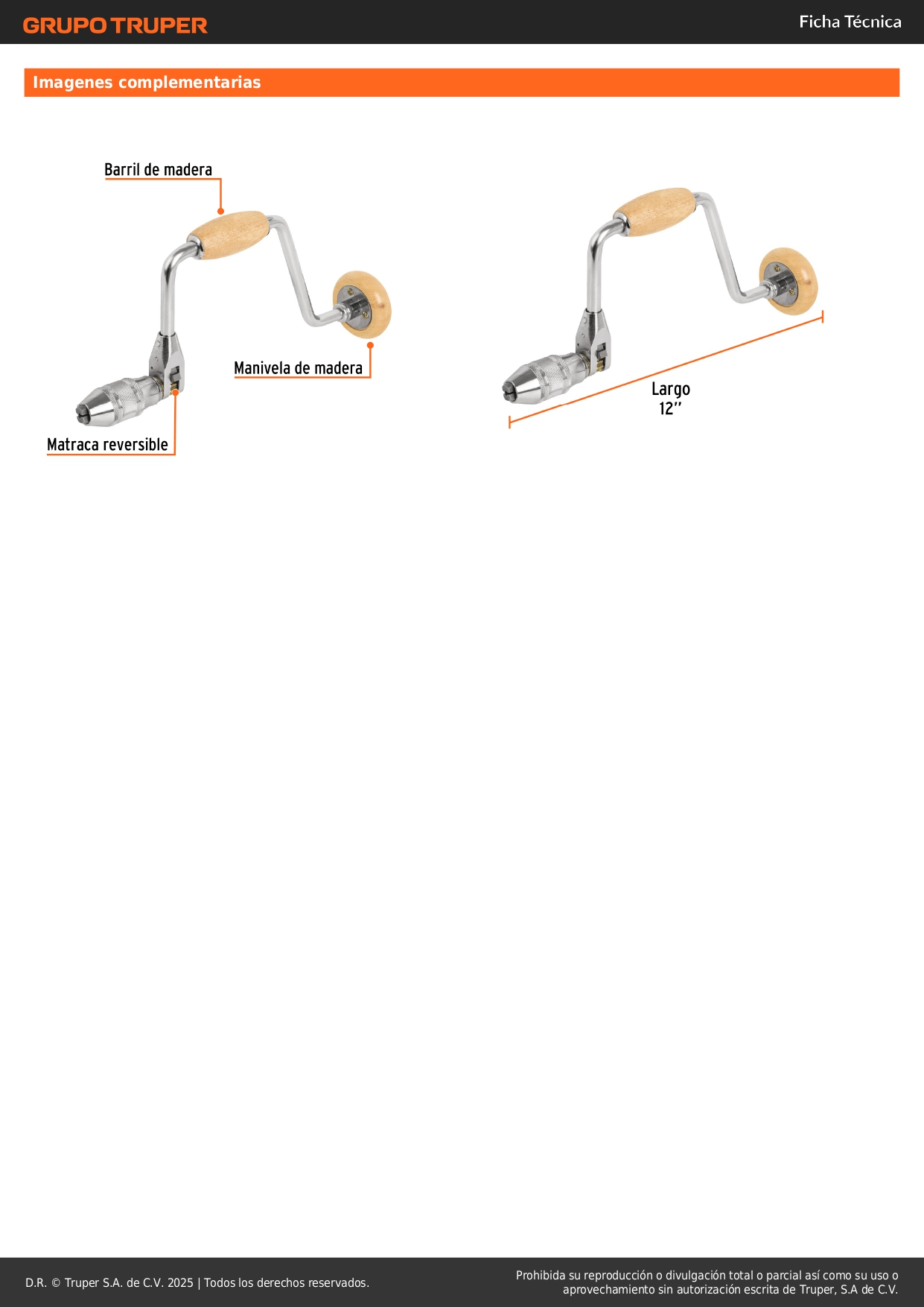 Berbiquí profesional 12 perilla de madera S/ 119.90 Agregar al carro Avísame cuando llegue -Barril y manivela fabricados de madera-Matraca reversible para perforar y atornillar madera-Se puede usar con destapacaños manual