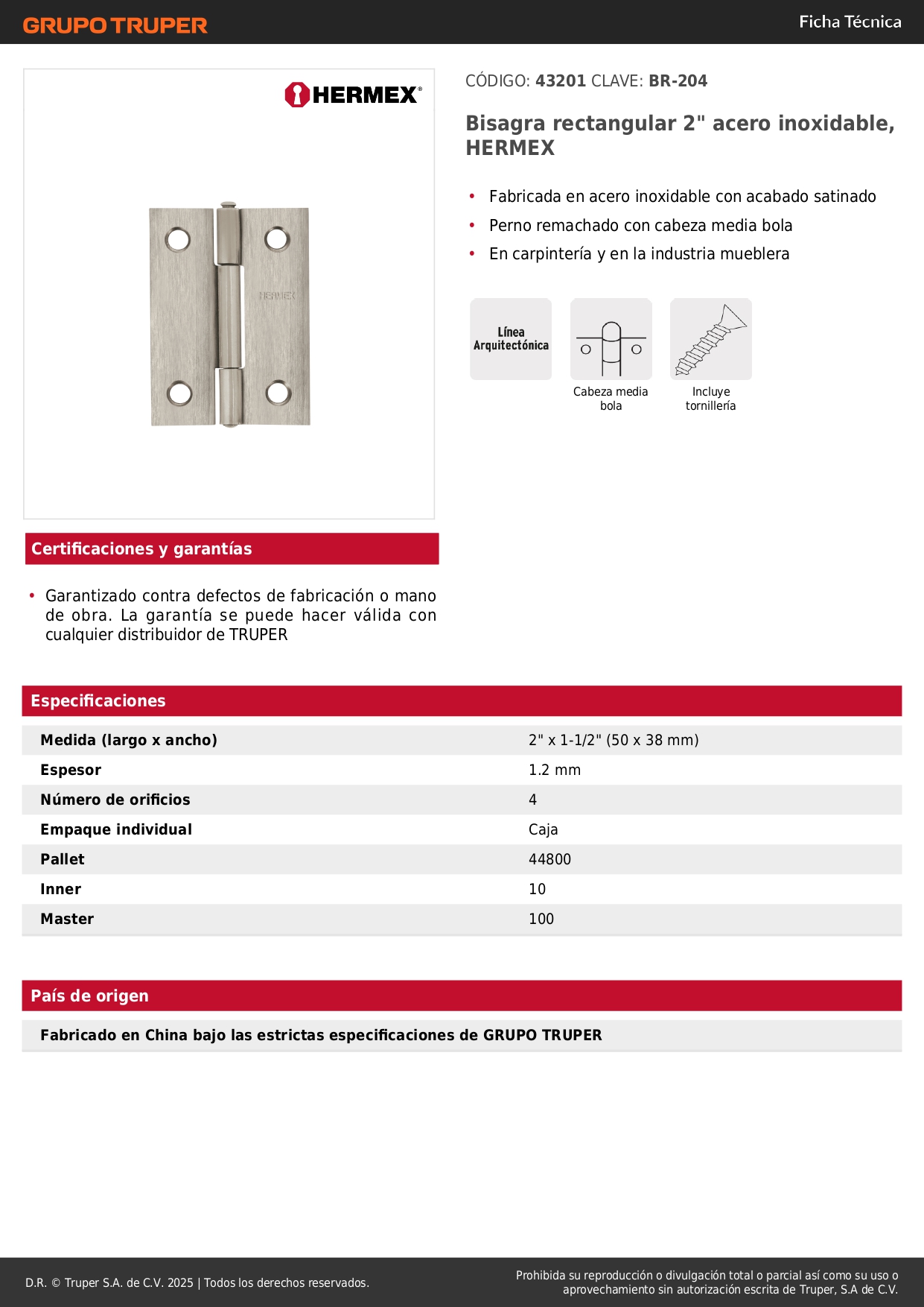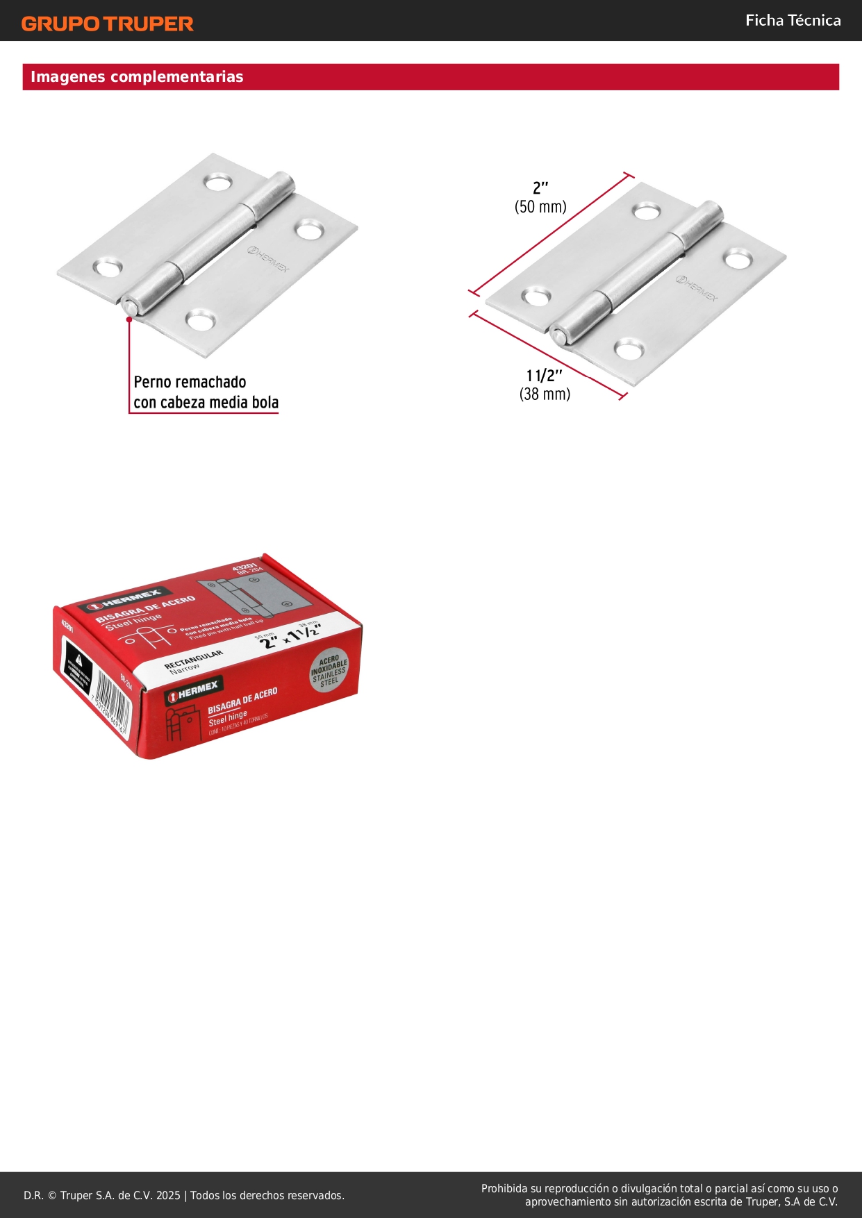Bisagra rectangular 2-1/2´´ acero pulido, cabeza media bola, hermex (caja de 10 unidades) S/ 34.00 Agregar al carro Avísame cuando llegue -Fabricada en acero inoxidable con acabado satinado-Perno remachado con cabeza media bola-En carpintería y en la industria mueblera