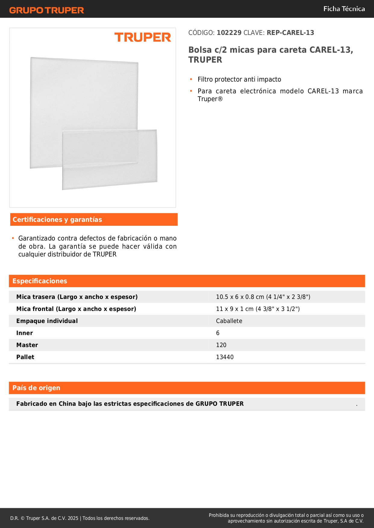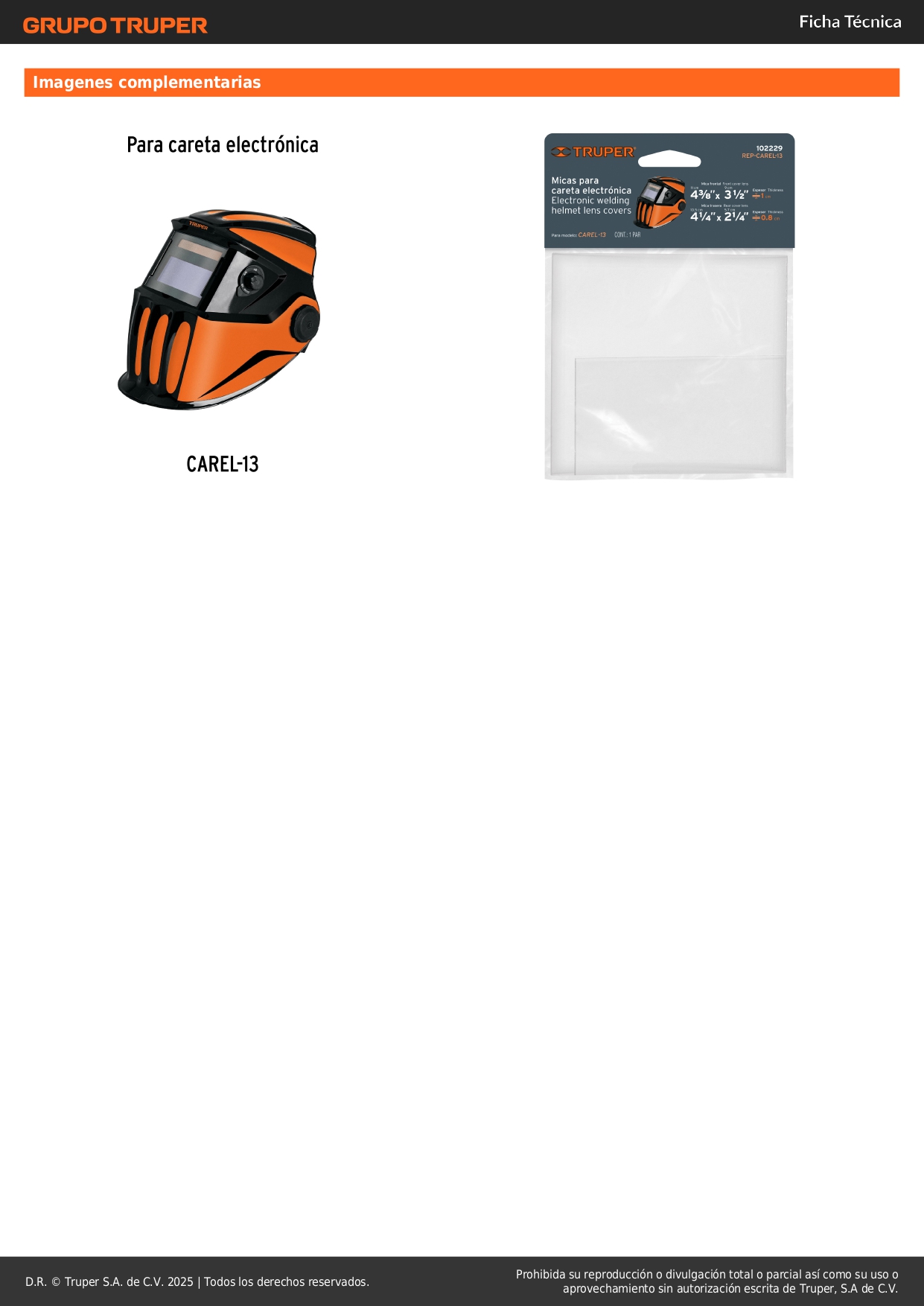 Bolsa c/2 micas para careta carel-13, truper S/ 5.50 Agregar al carro Avísame cuando llegue -Filtro protector anti impacto-Para careta electrónica modelo CAREL-13 marca Truper®