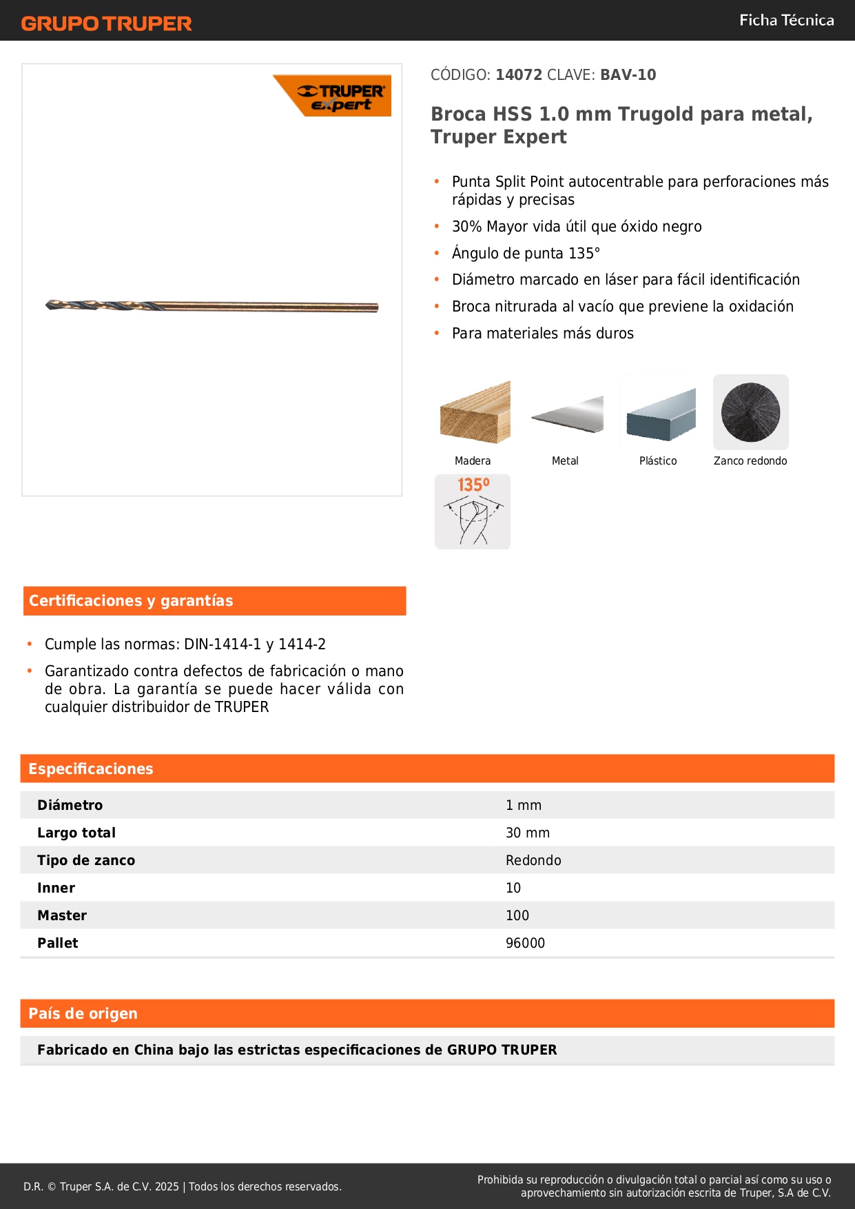 Broca hss 1.0 mm trugold para metal, truper expert por unidad