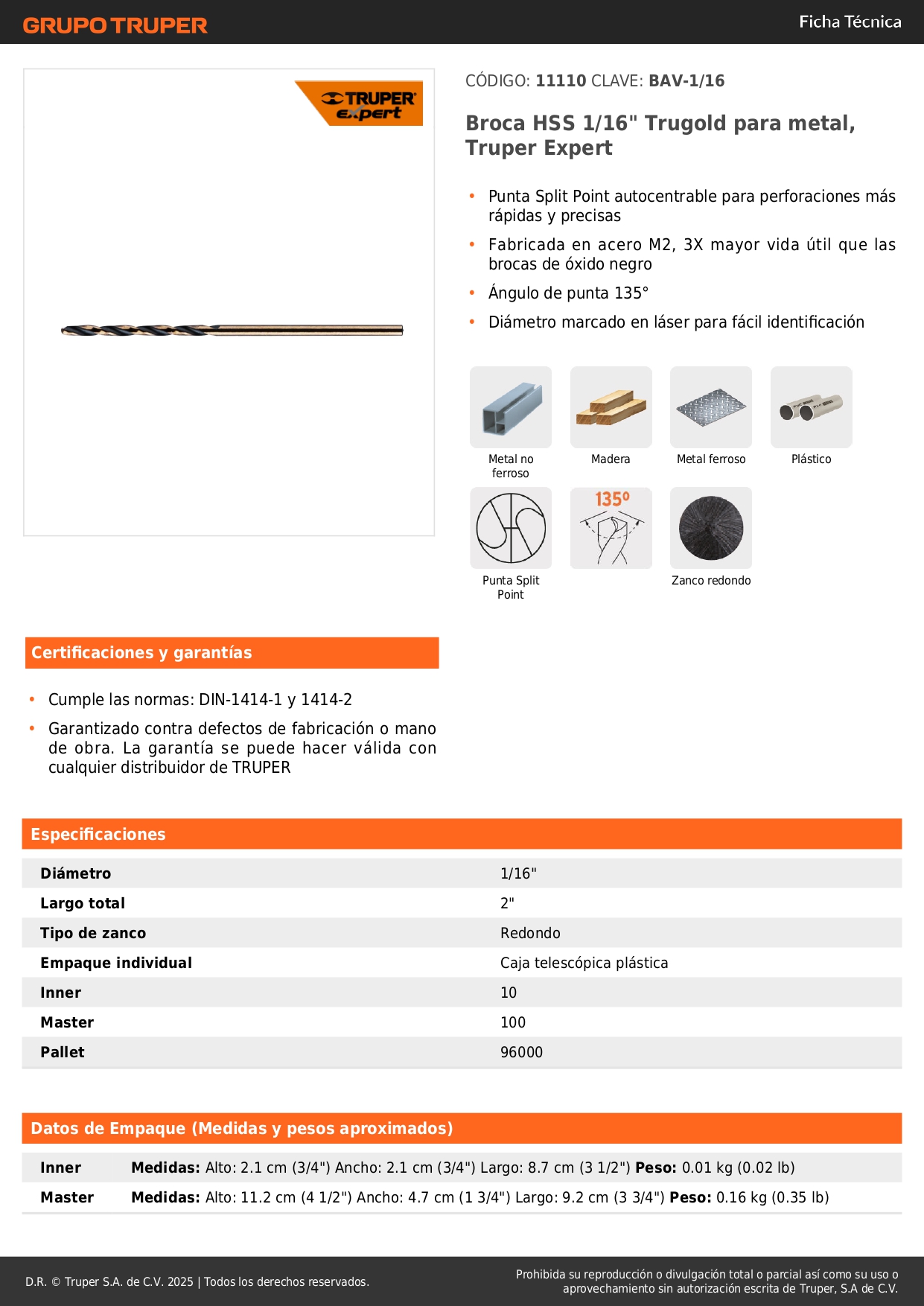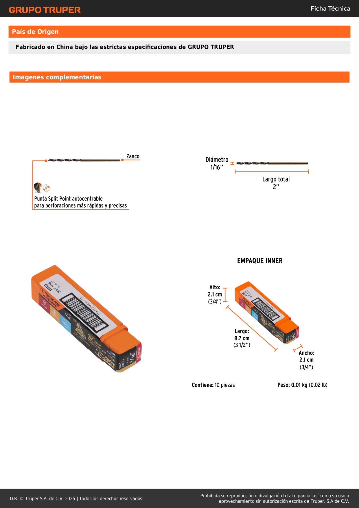 Broca hss 1/16" trugold para metal, truper expert por unidad