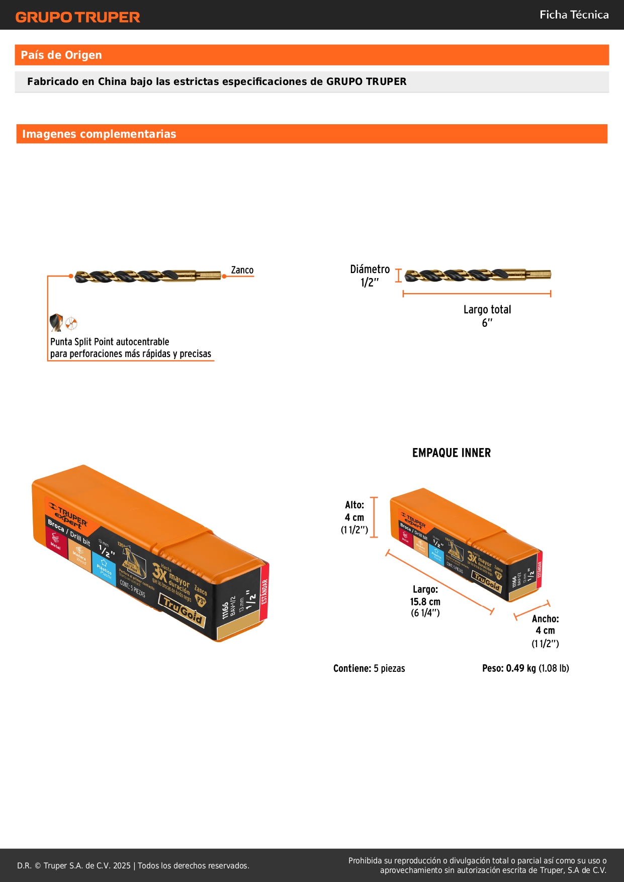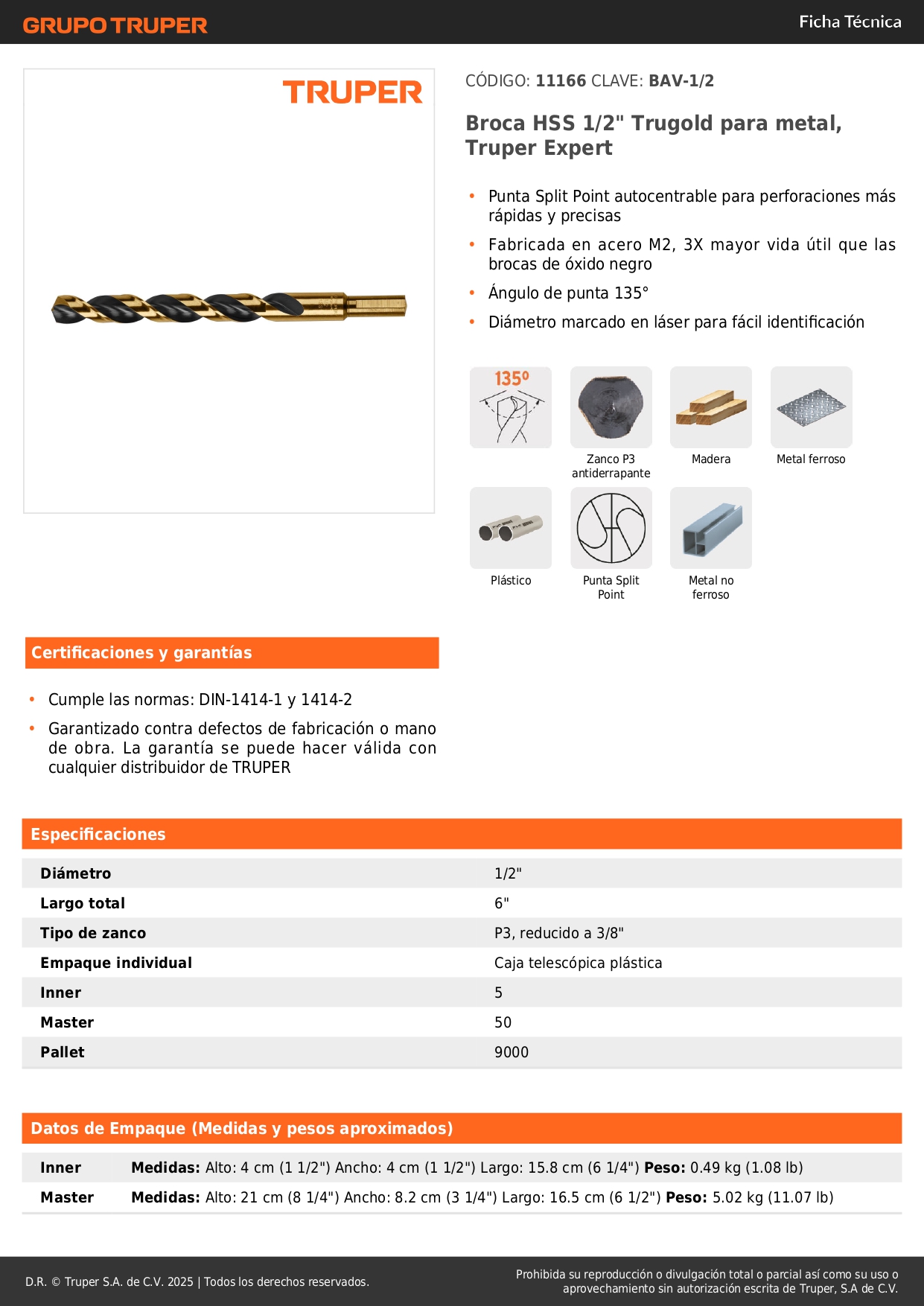 Broca hss 1/2' trugold para metal, truper expert por unidad