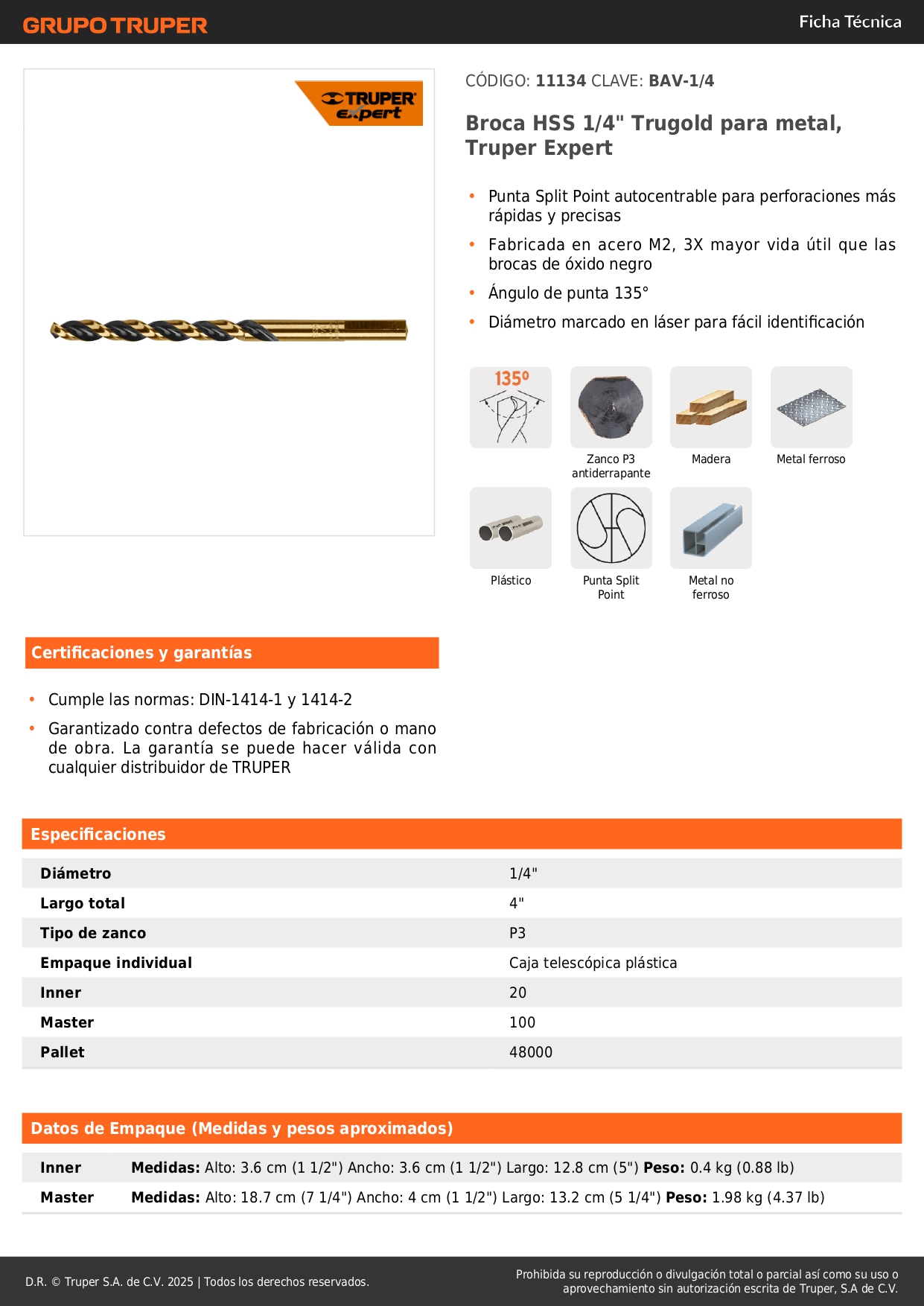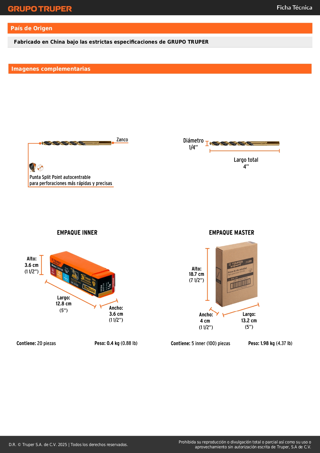 Broca hss 1/4' trugold para metal, truper expert por unidad