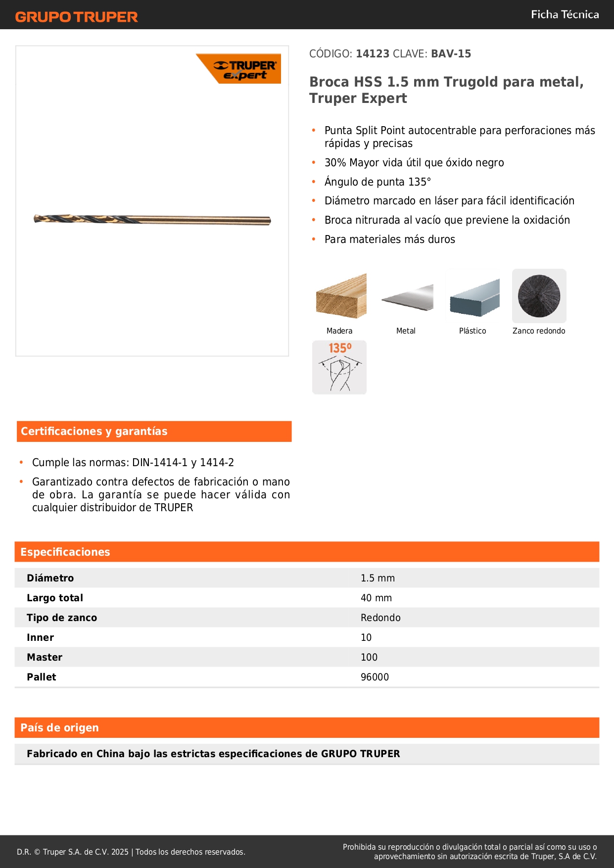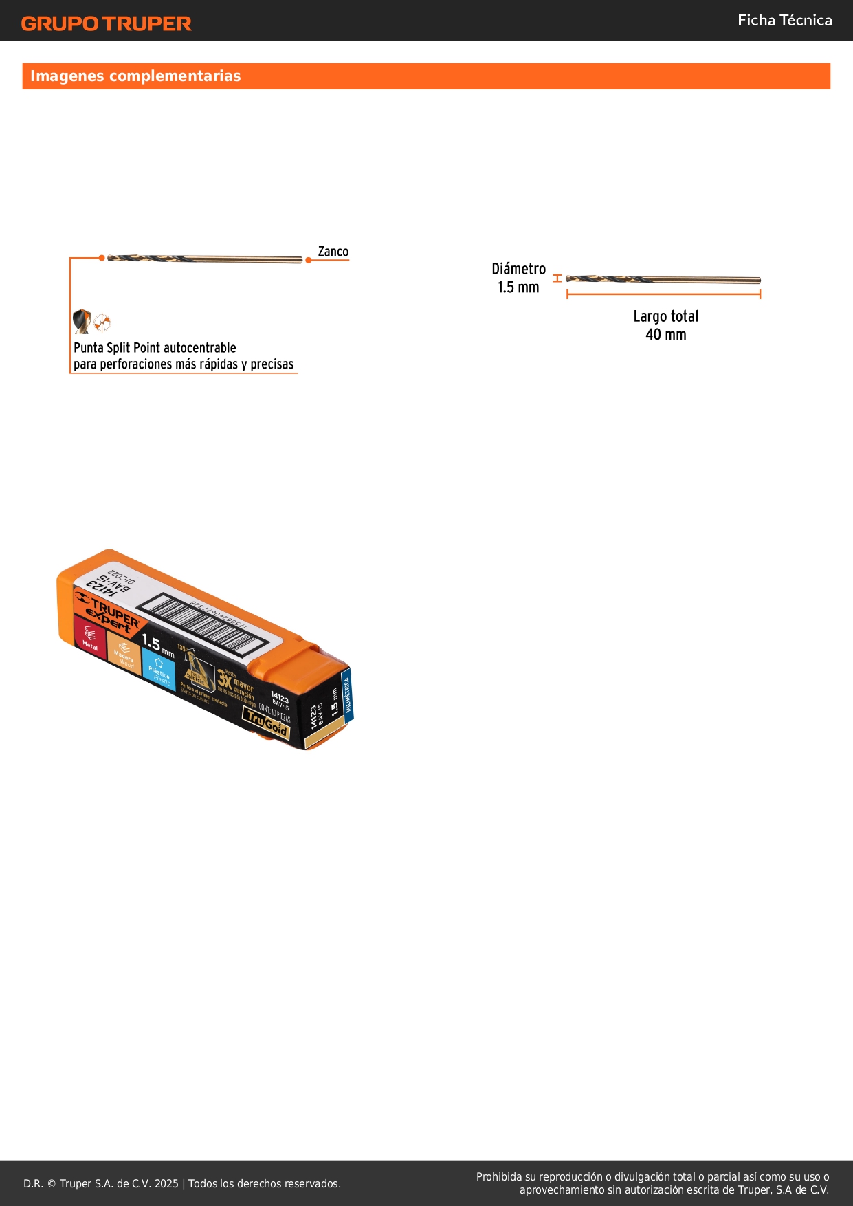 Broca hss 1.5 mm trugold para metal, truper expert por unidad