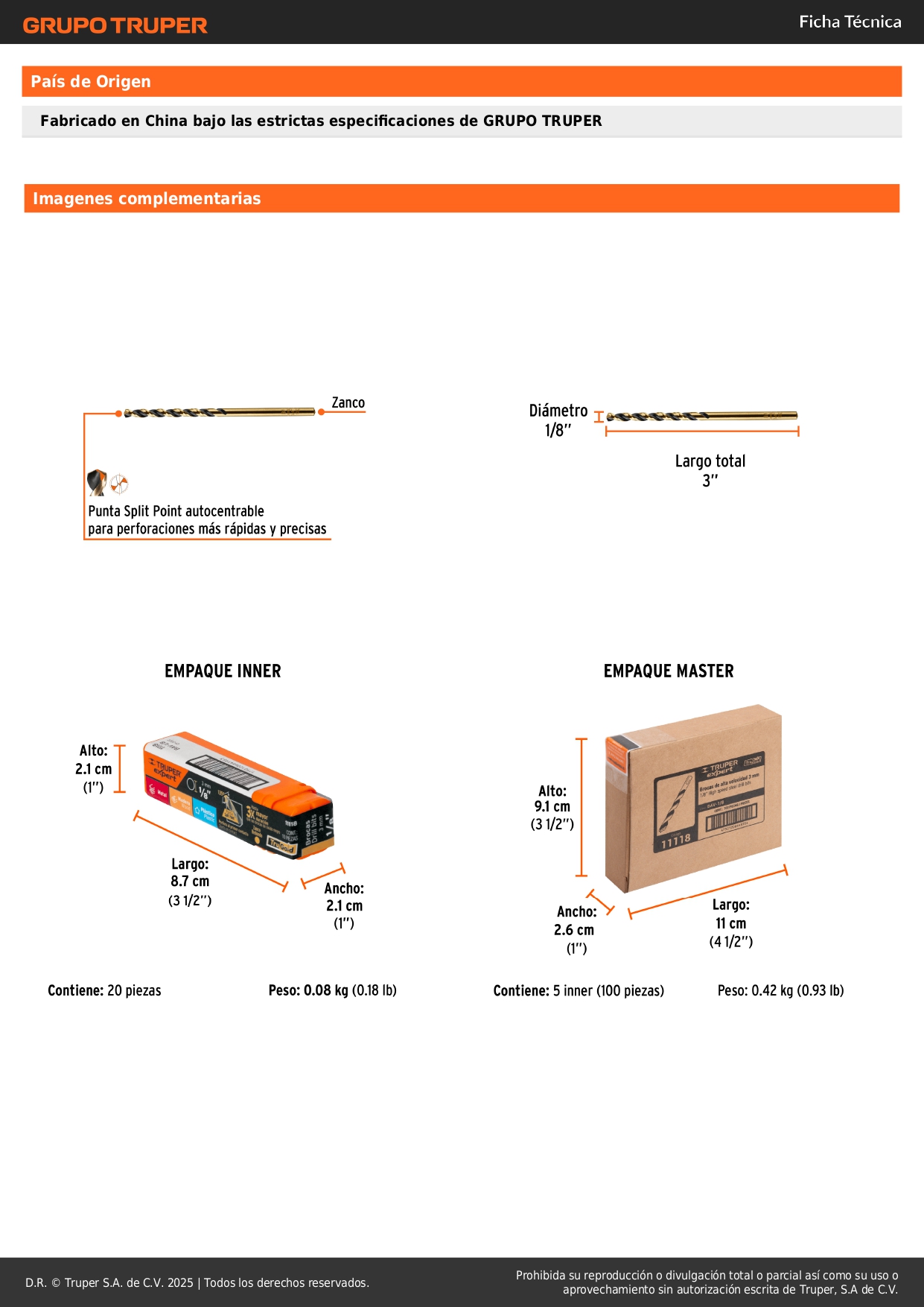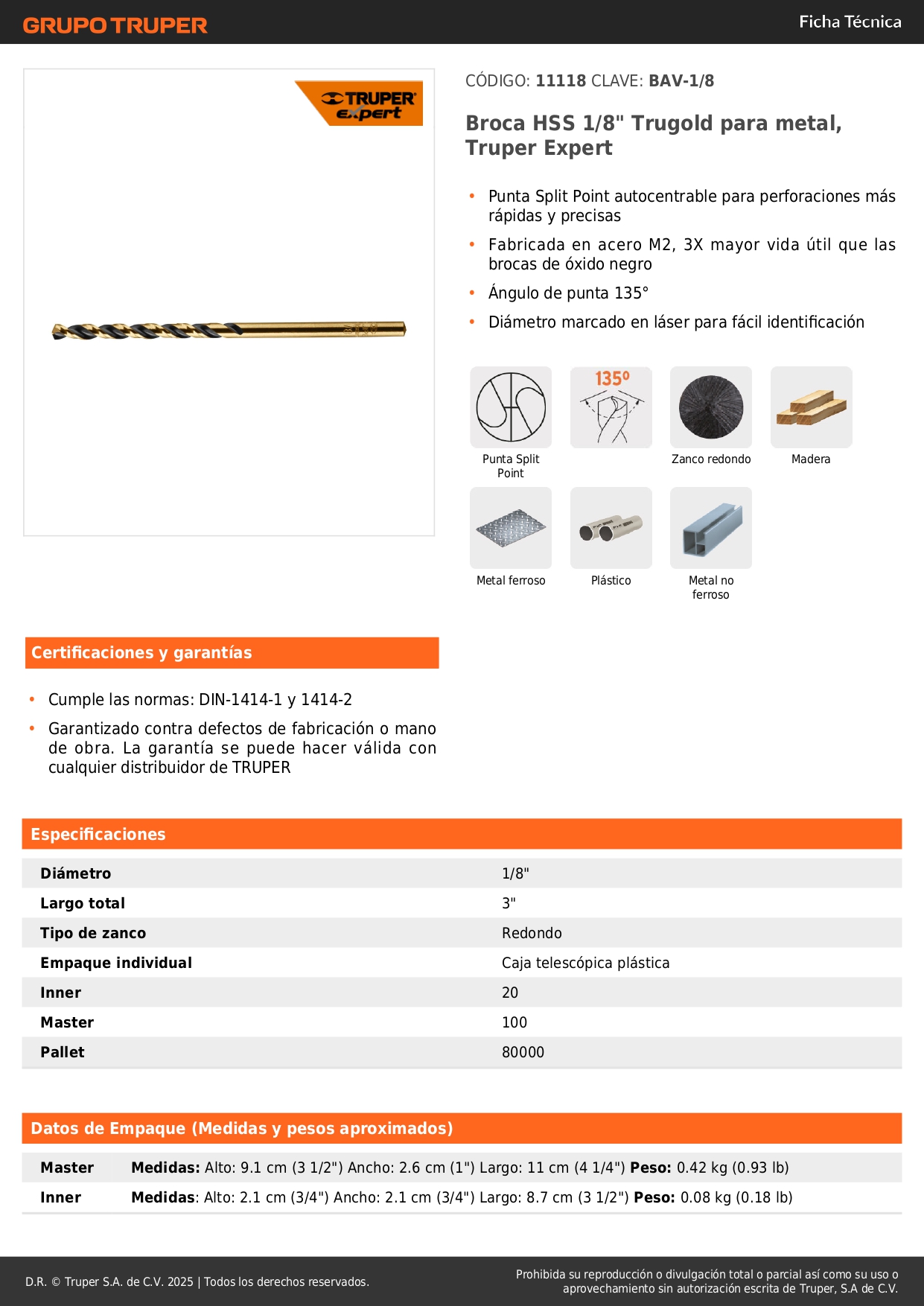 Broca hss 1/8' trugold para metal, truper expert por unidad