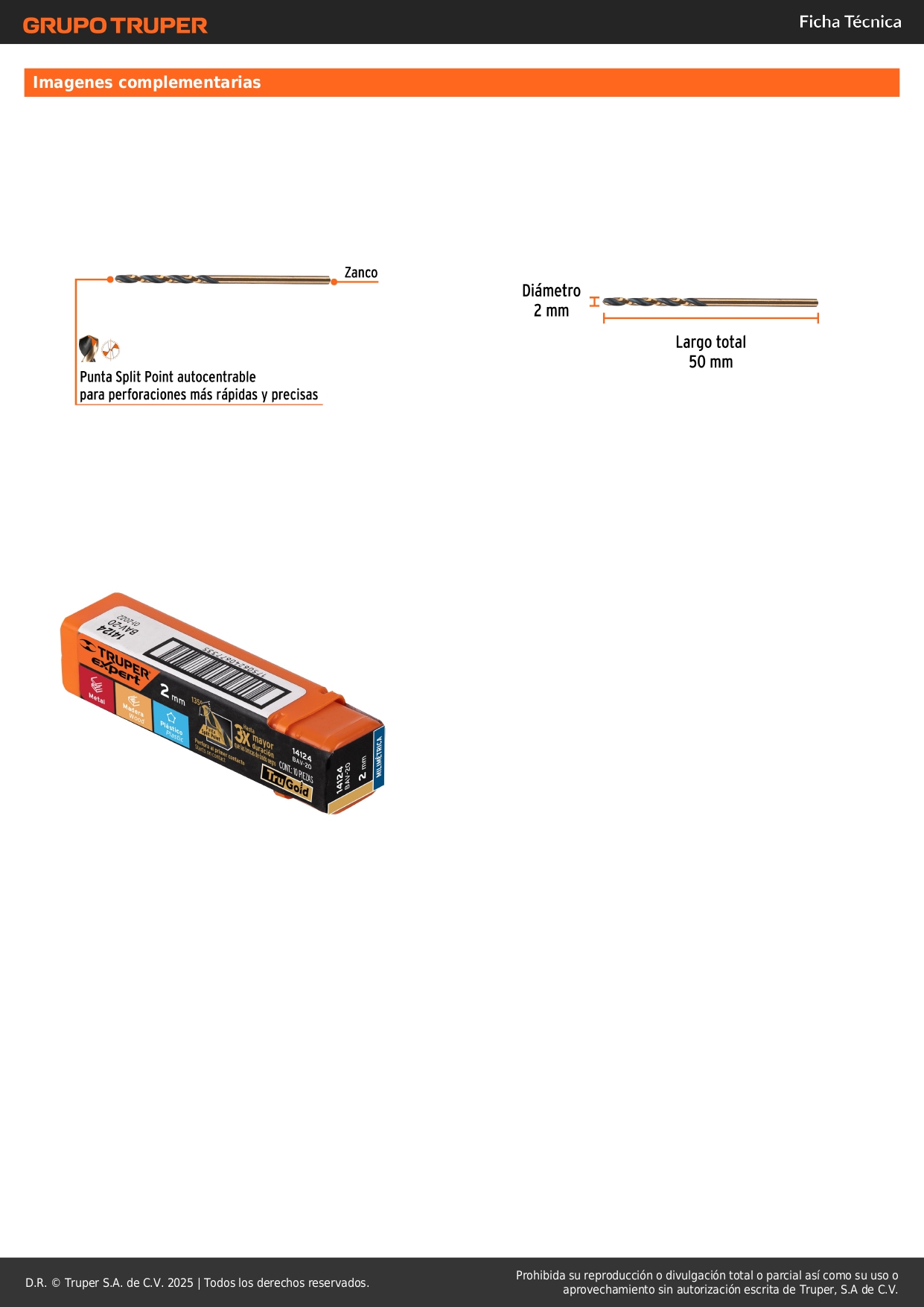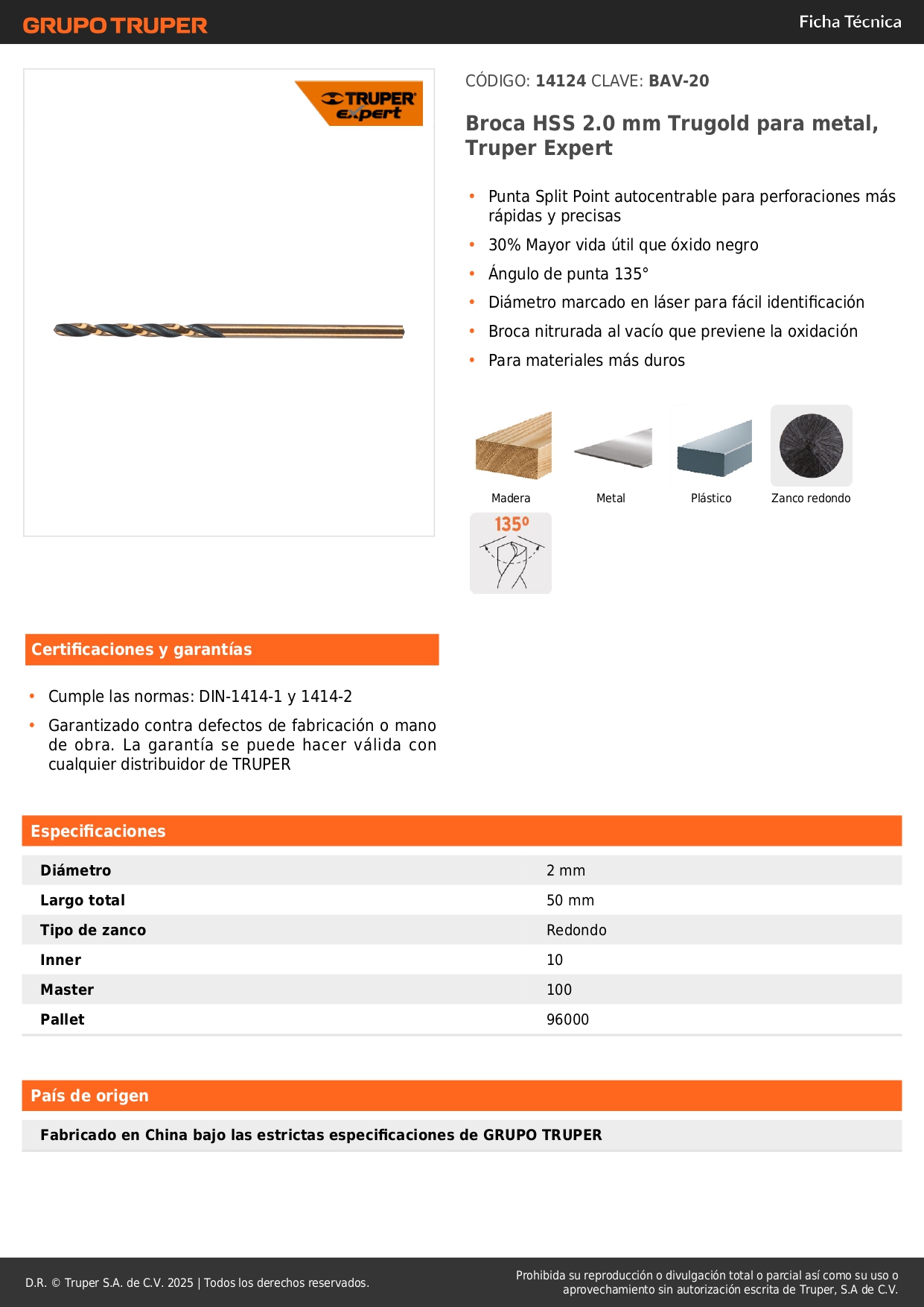 Broca hss 2.0 mm trugold para metal, truper expert por unidad