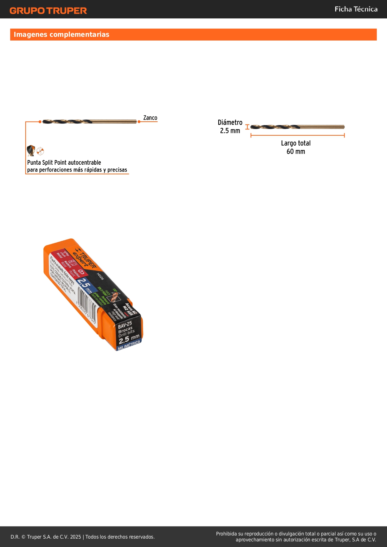 Broca hss 2.5 mm trugold para metal, truper expert por unidad