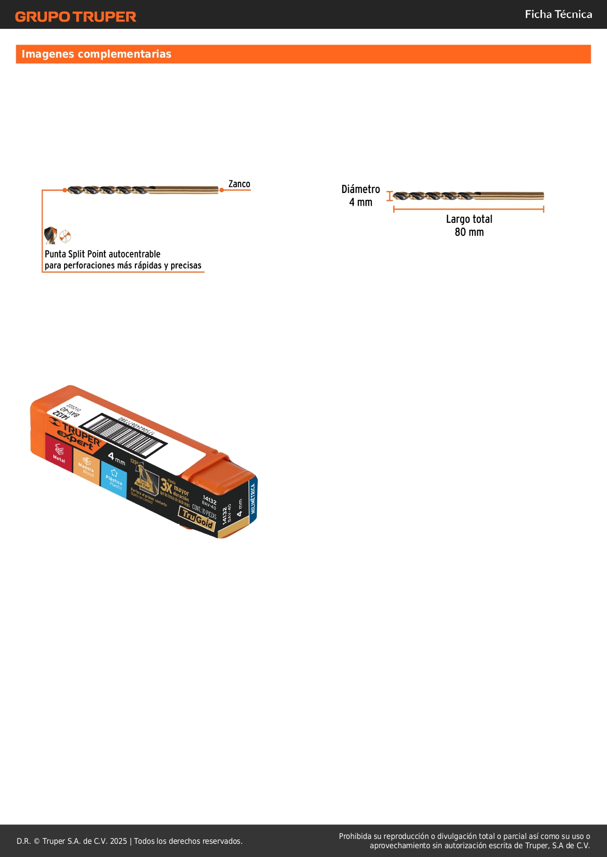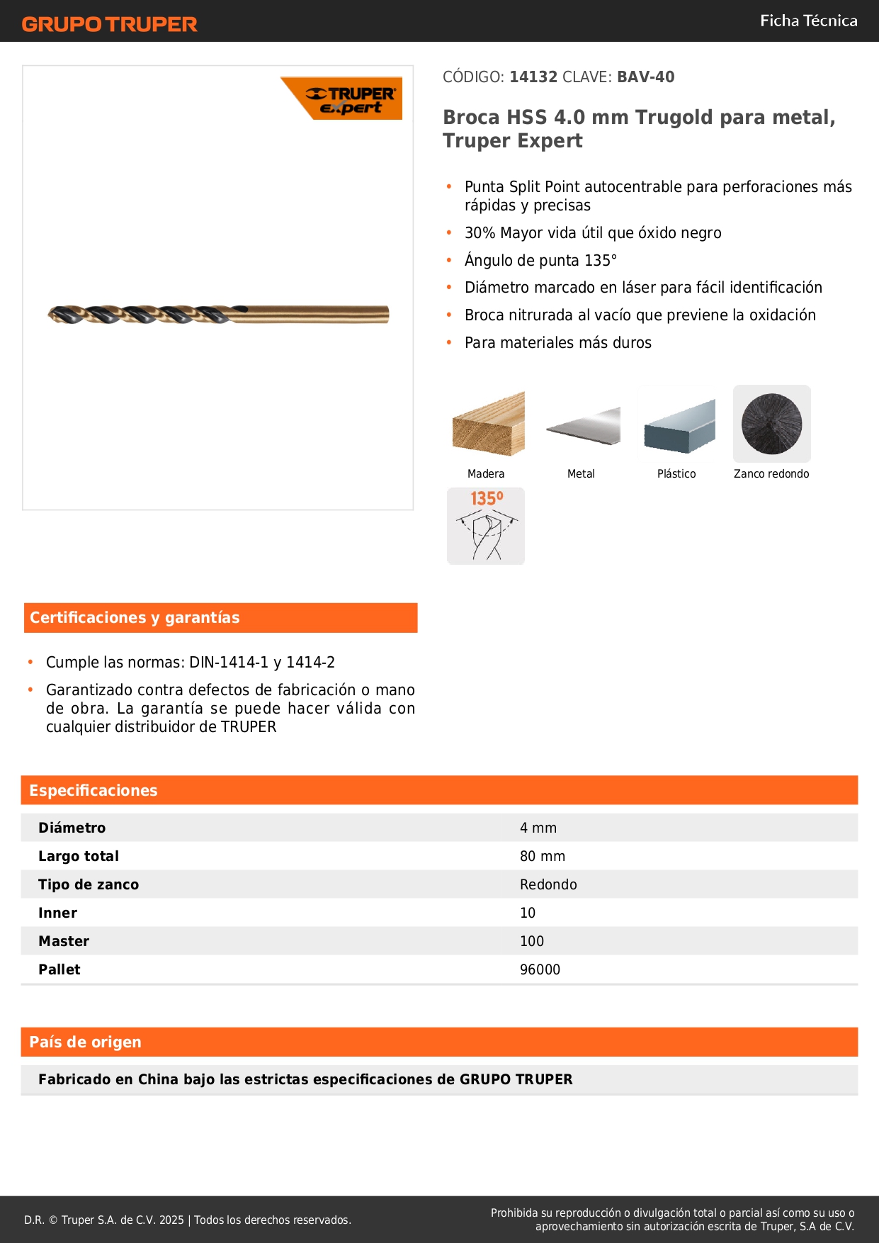 Broca hss 4.0 mm trugold para metal, truper expert por unidad