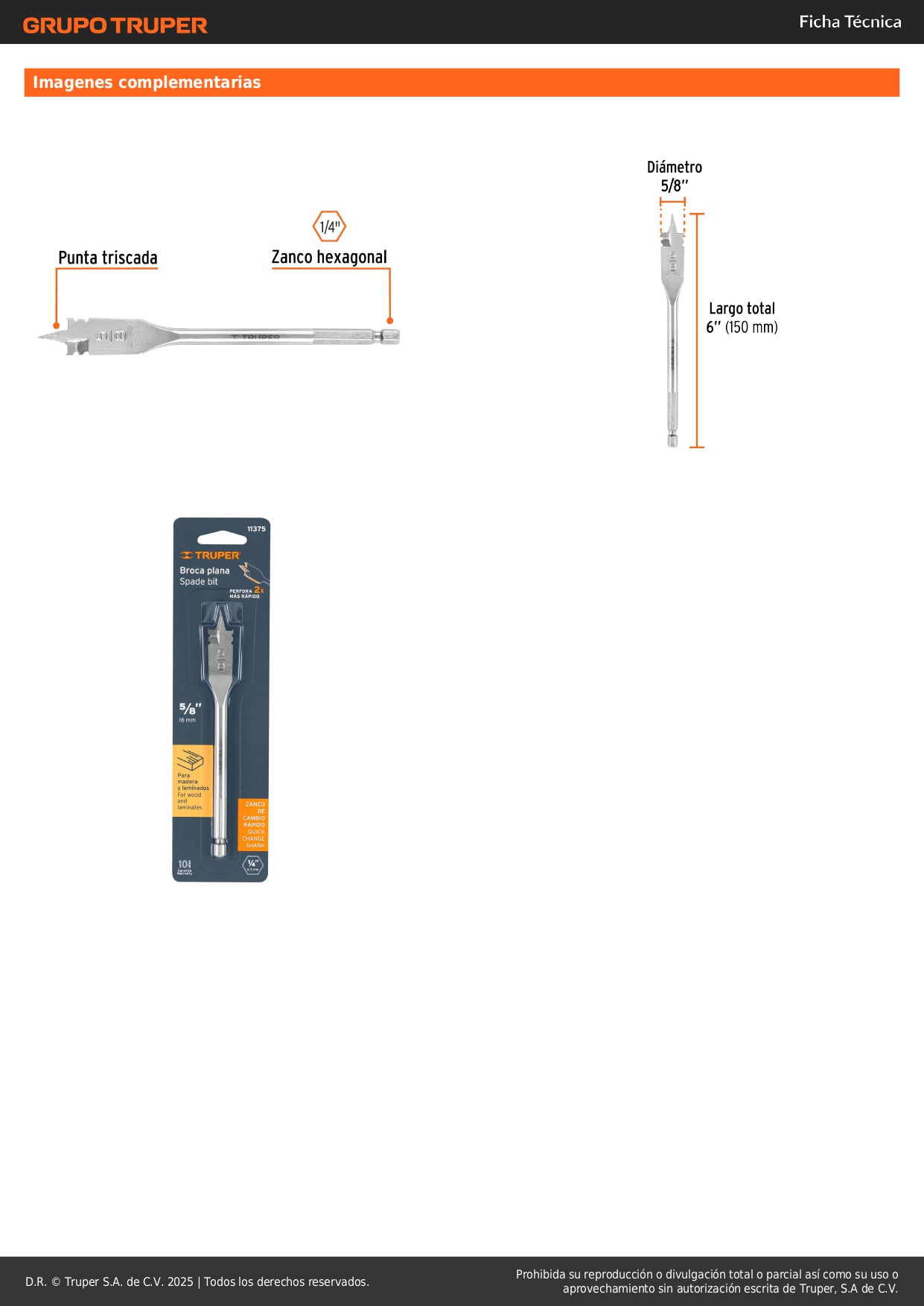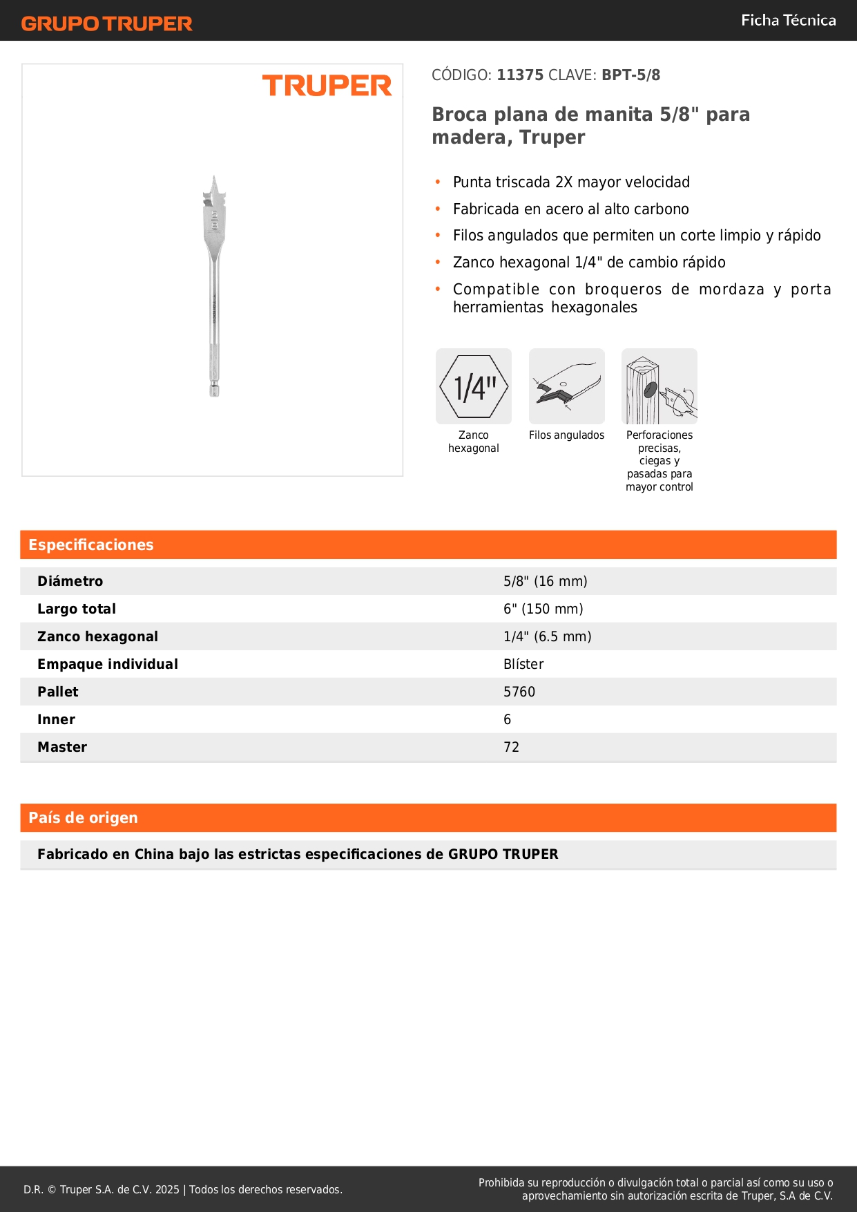 Broca paleta 5/8'' para madera truper