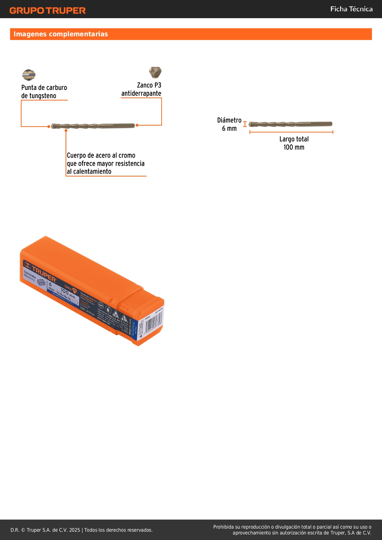 Broca para concreto 6 x 100 mm, truper por unidad S/ 2.00 Agregar al carro Avísame cuando llegue -Cuerpo de acero al cromo que ofrece mayor resistencia al calentamiento-Punta de carburo de tungsteno-Zanco P3 antiderrapante-Para ladrillo y concreto