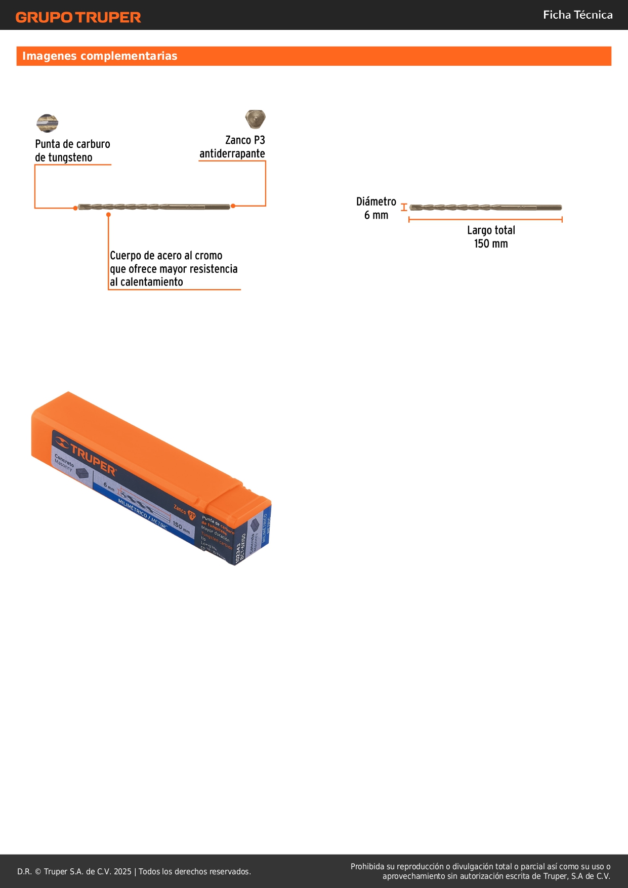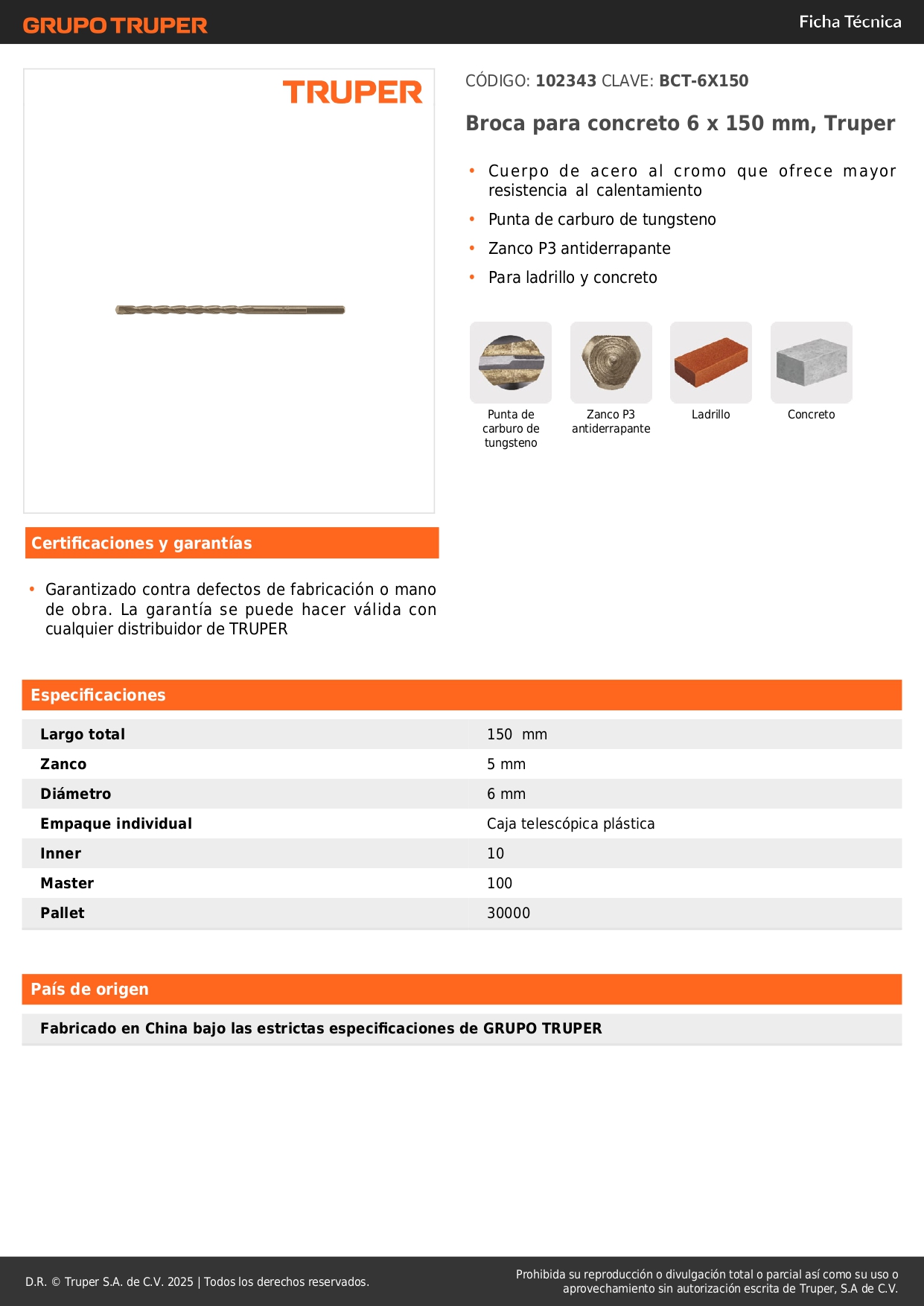 Broca para concreto 6 x 150 mm, truper por unidad S/ 2.30 Agregar al carro Avísame cuando llegue -Cuerpo de acero al cromo que ofrece mayor resistencia al calentamiento-Punta de carburo de tungsteno-Zanco P3 antiderrapante-Para ladrillo y concreto