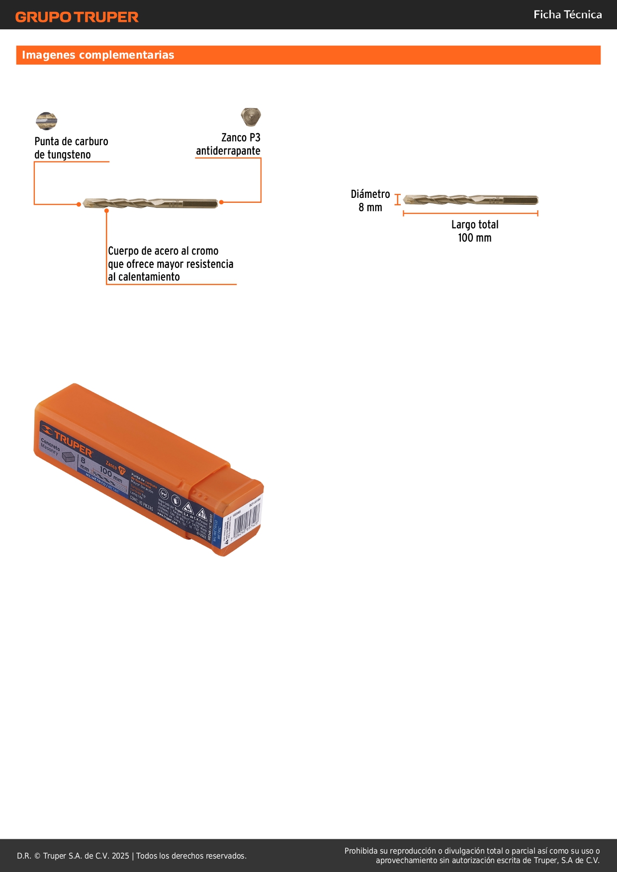 Broca para concreto 8 x 100 mm, truper por unidad S/ 2.50 Agregar al carro Avísame cuando llegue -Cuerpo de acero al cromo que ofrece mayor resistencia al calentamiento-Punta de carburo de tungsteno-Zanco P3 antiderrapante-Para ladrillo y concreto