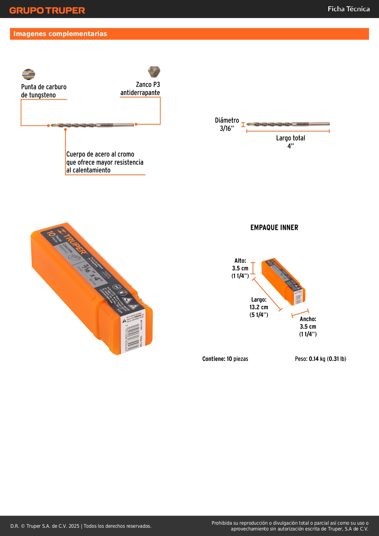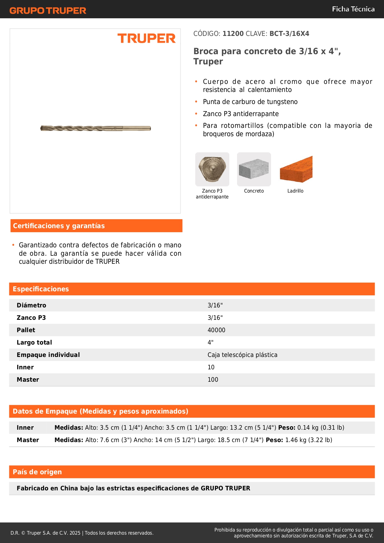 Broca para concreto de 3/16 x 4'', truper por unidad