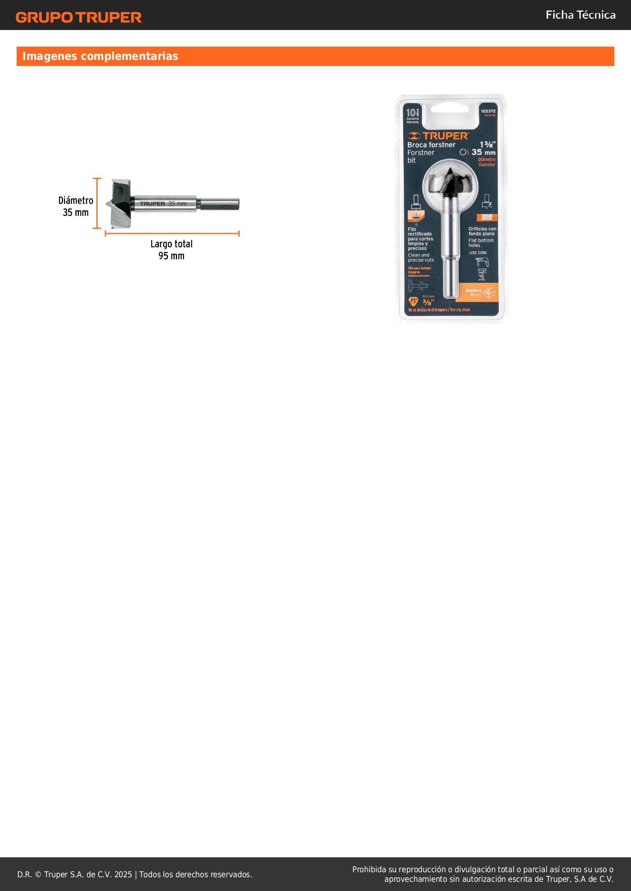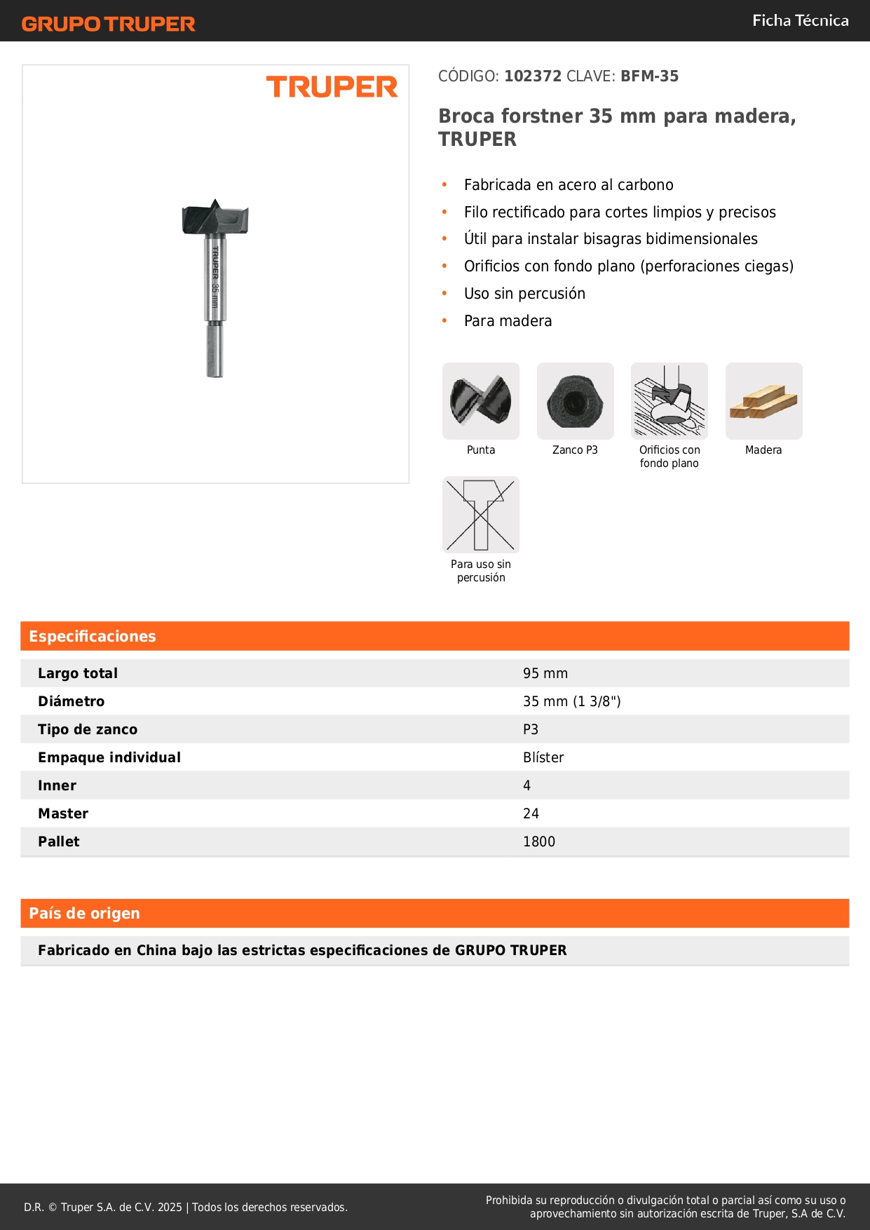 Broca para madera forstner 35mm truper S/ 25.90 Agregar al carro Avísame cuando llegue -Fabricada en acero al carbono-Filo rectificado para cortes limpios y precisos-Útil para instalar bisagras bidimensionales-Orificios con fondo plano (perforaciones ciegas)-Uso sin percusión