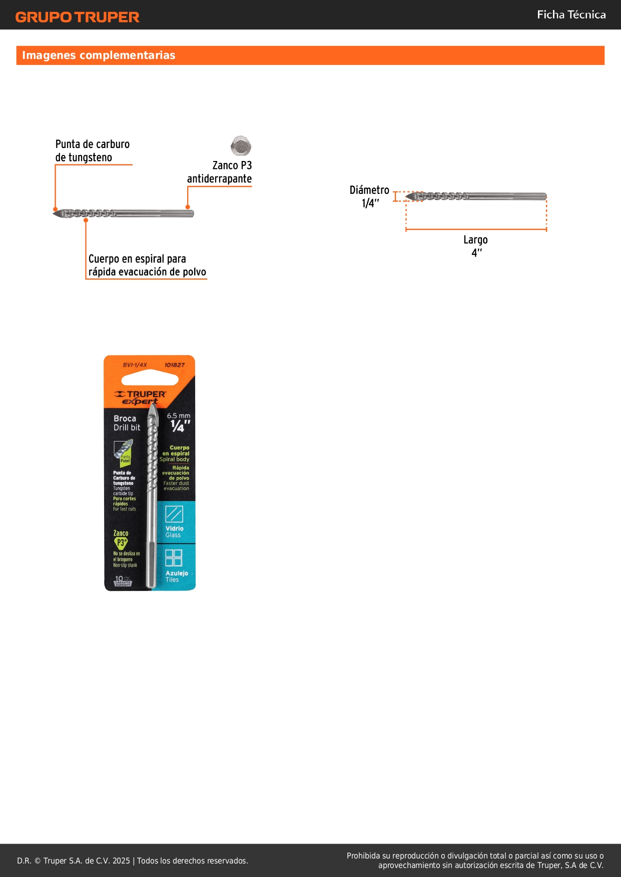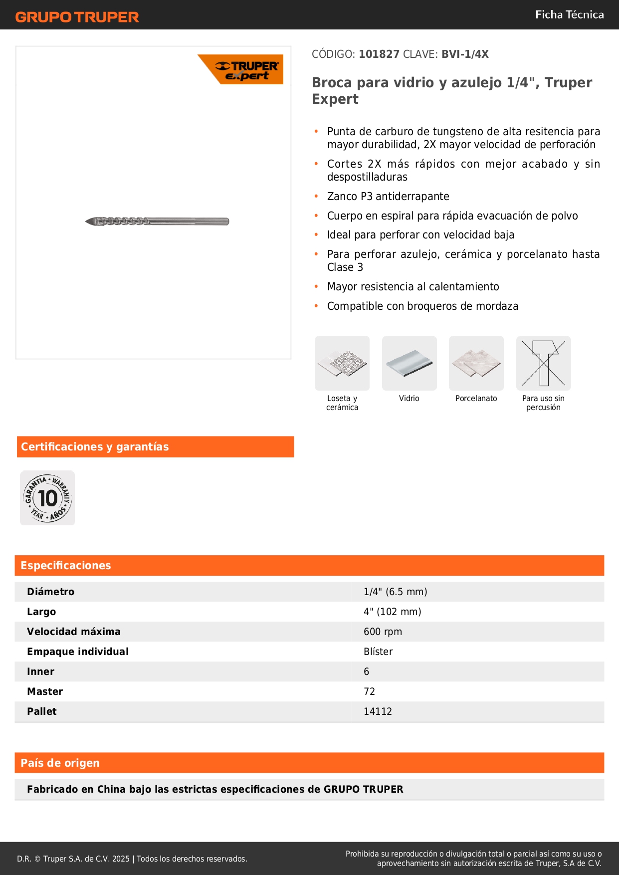 Broca para vidrio y mayólica 1/4´´, truper expert