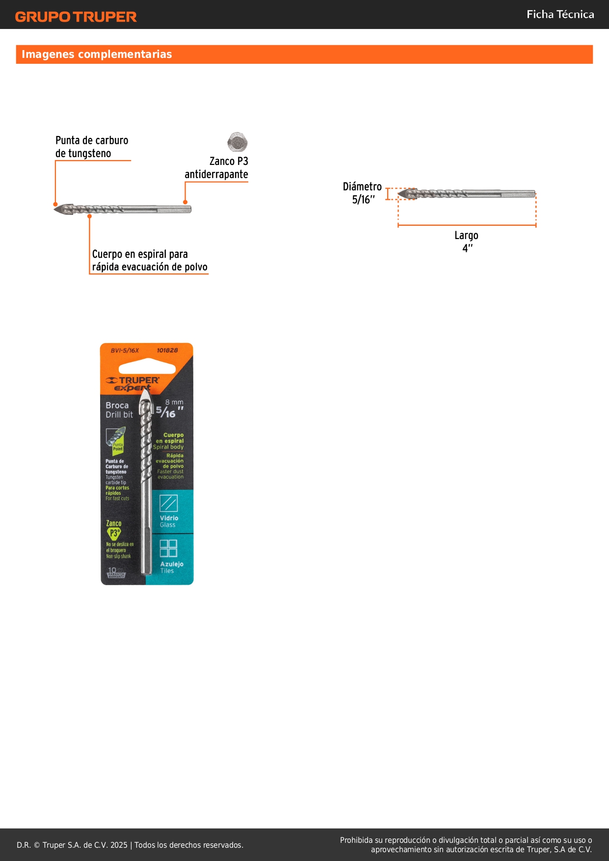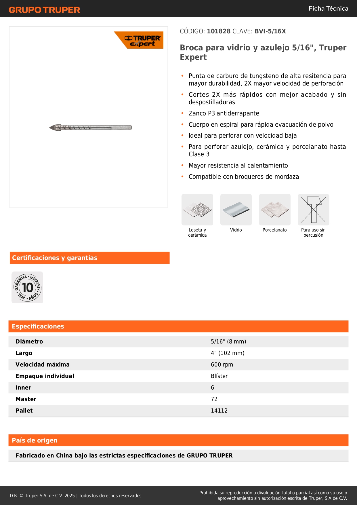 Broca para vidrio y mayólica 5/16´´, Truper Expert4