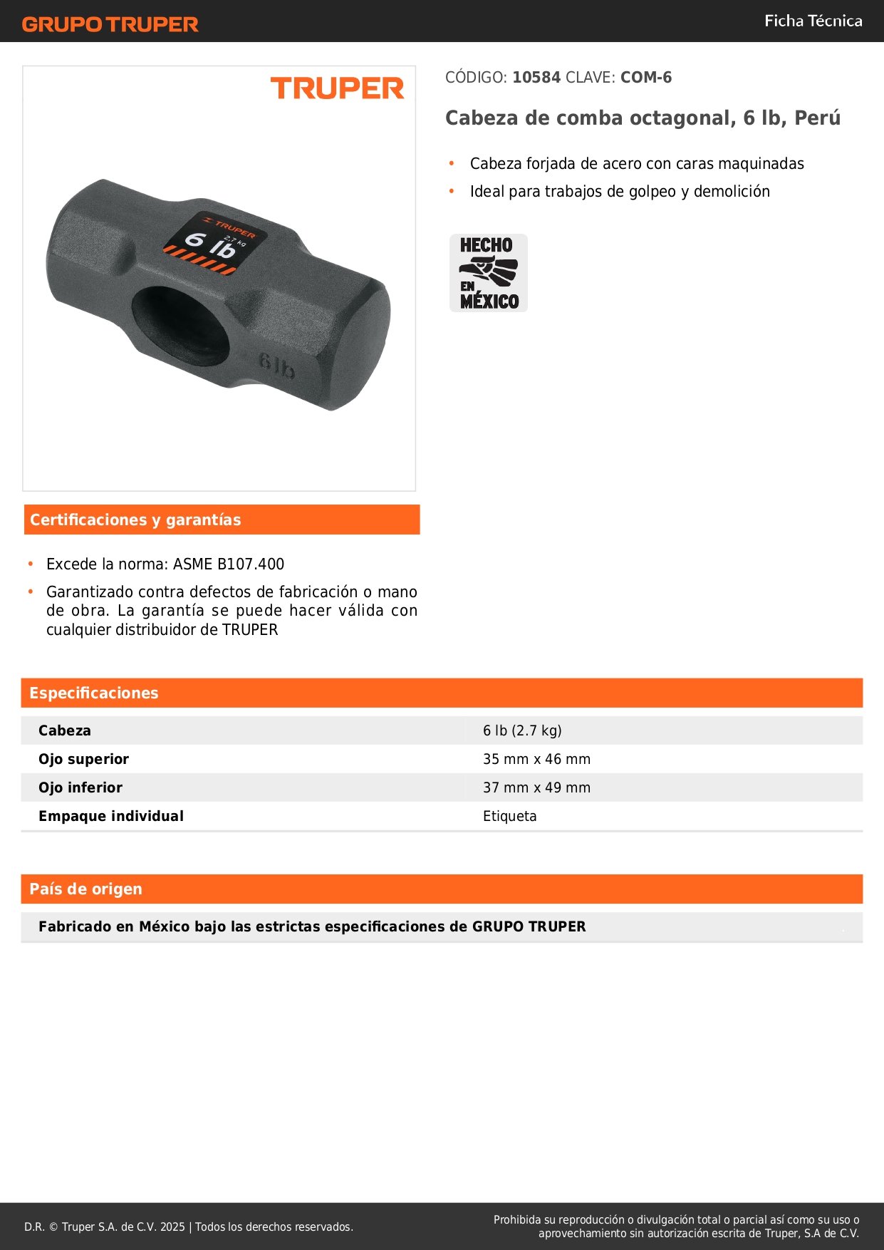 Cabeza de comba octagonal de 6 lb, truper S/ 34.80 Agregar al carro Avísame cuando llegue -Cabeza forjada de acero con caras maquinadas-Ideal para trabajos de golpeo y demolición
