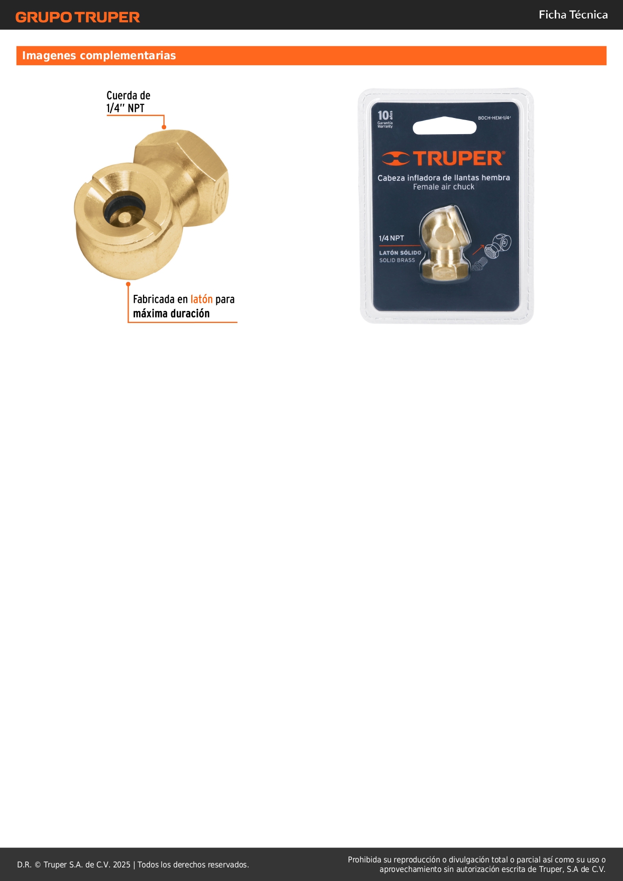 Cabeza infladora de llantas, hembra, cuerda 1/4 npt, truper S/ 7.60 Agregar al carro Avísame cuando llegue -Fabricada en latón para máxima duración-Compatible con válvulas americanas tipo Schrader