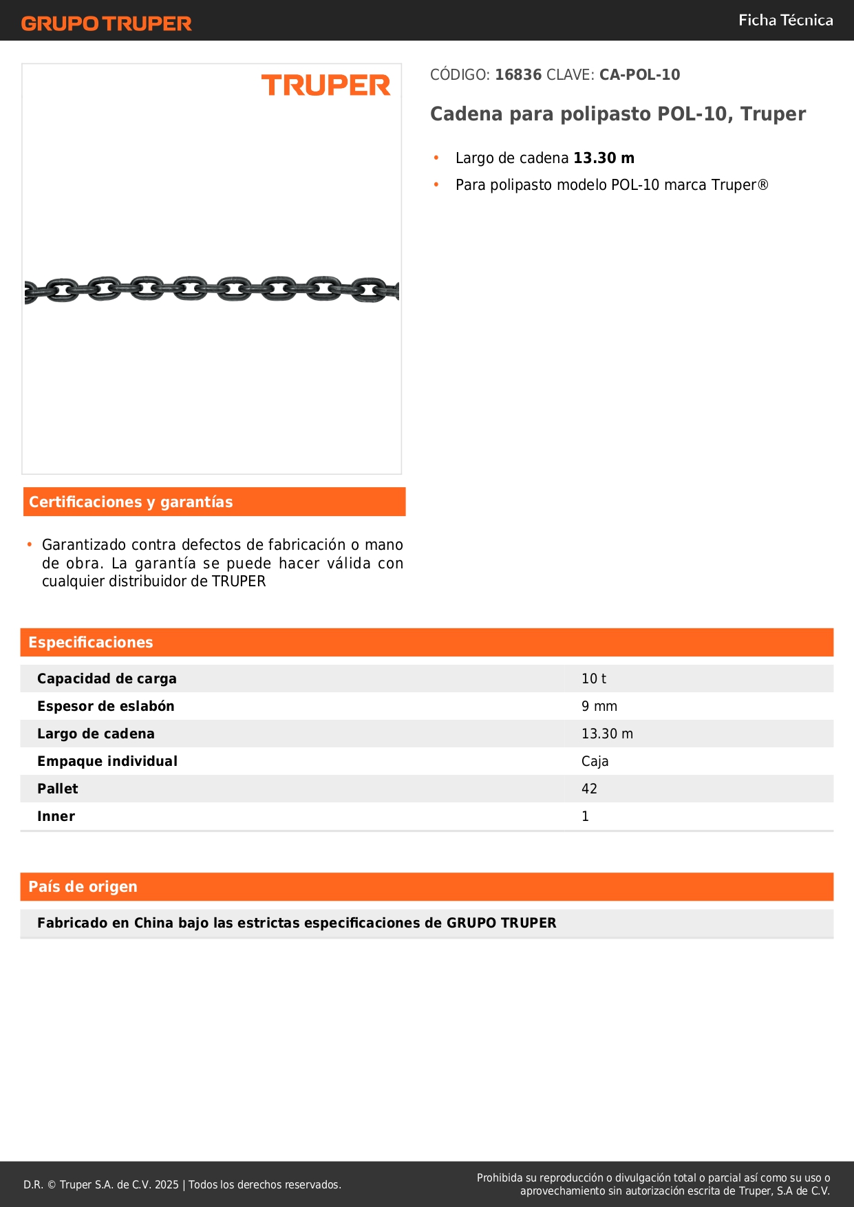 Cadena para polipasto POL-10, Truper