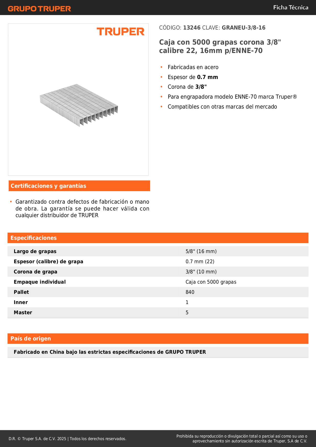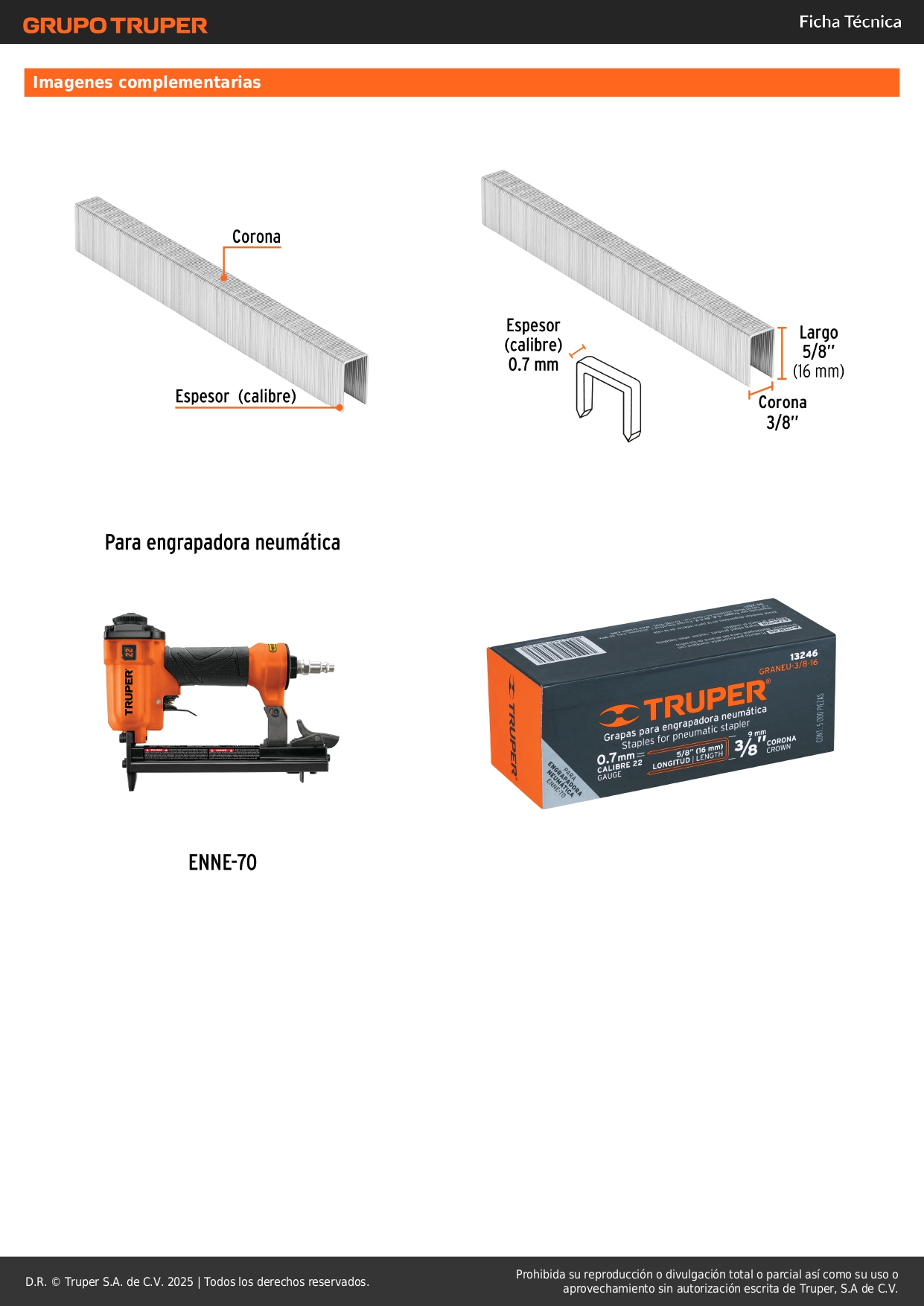 Caja con 5000 grapas corona 3/8´´ calibre 22, 16mm p/enne-70 truper S/ 15.30 Agregar al carro Avísame cuando llegue -Fabricadas en acero-Espesor de 0.7 mm-Corona de 3/8"-Para engrapadora modelo ENNE-70 marca Truper®-Compatibles con otras marcas del mercado