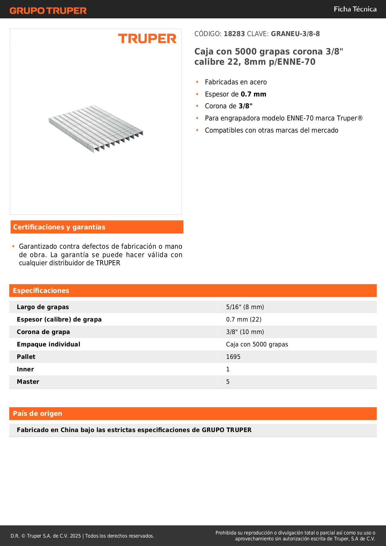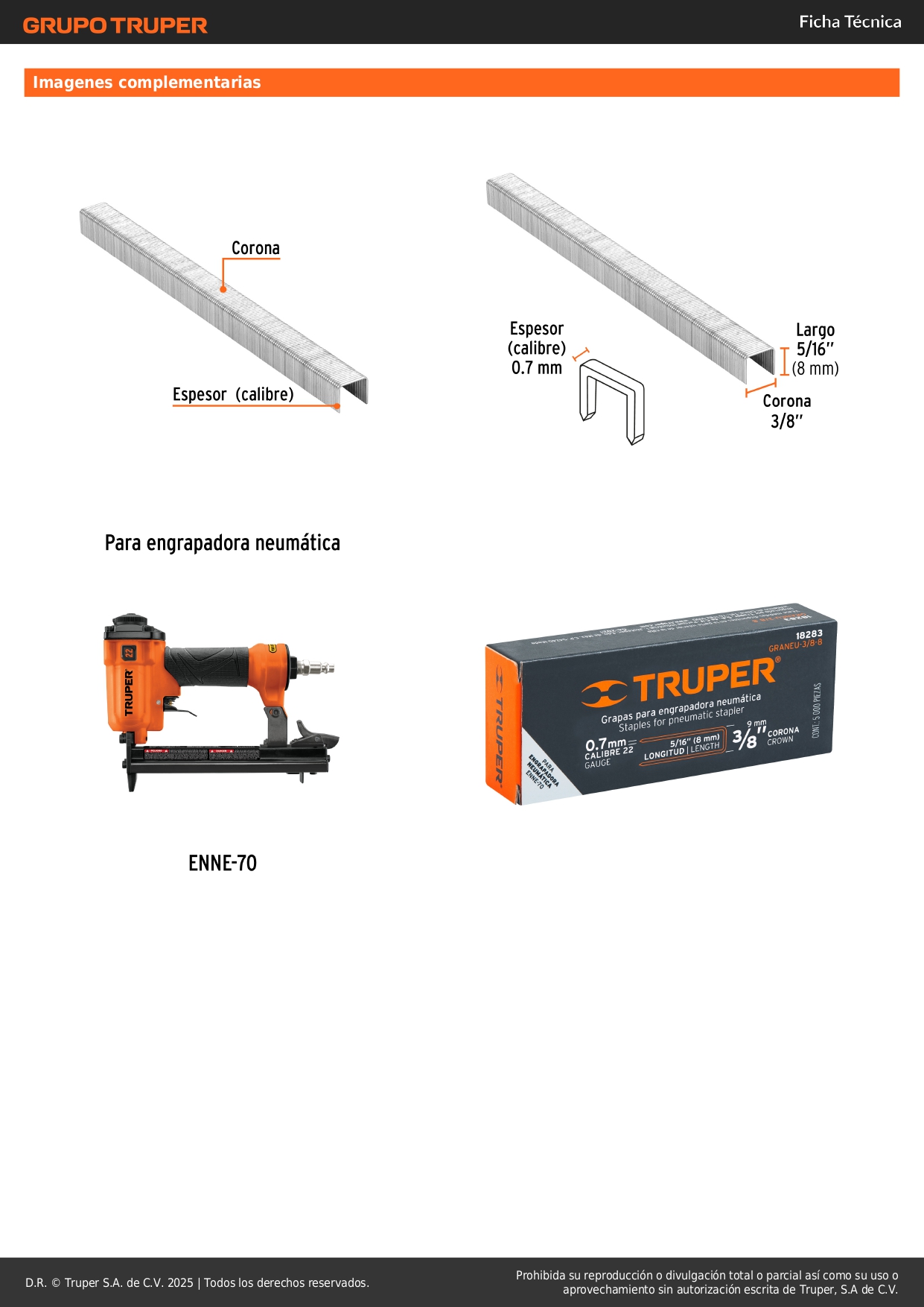 Caja con 5000 grapas corona 3/8'' calibre 22. 8mm p/enne-70 truper S/ 10.50 Agregar al carro Avísame cuando llegue -Fabricadas en acero-Espesor de 0.7 mm-Corona de 3/8"-Para engrapadora modelo ENNE-70 marca Truper®-Compatibles con otras marcas del mercado
