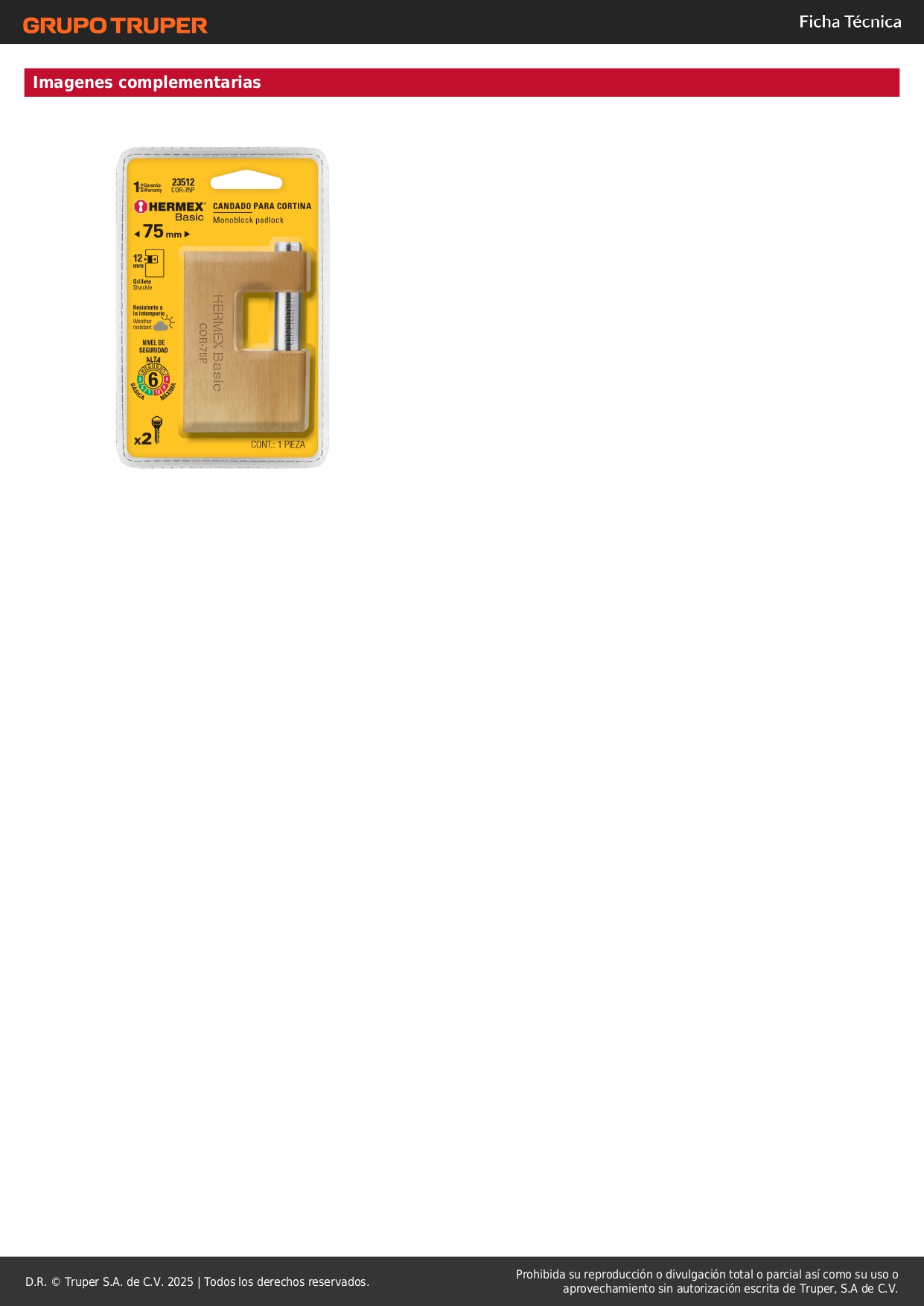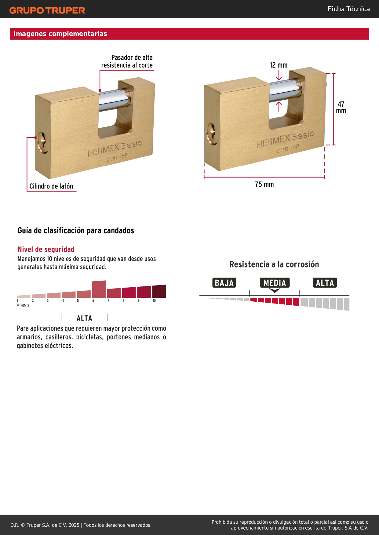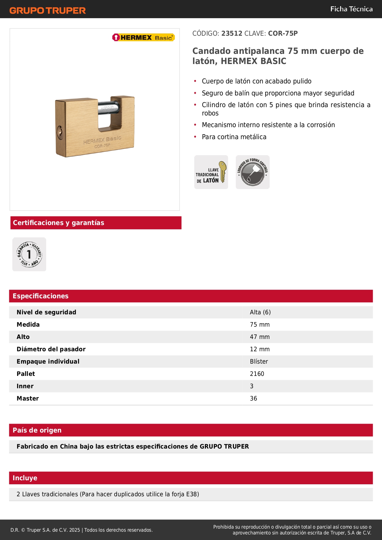 Candado antipalanca 75 mm cuerpo de latón, hermex basic