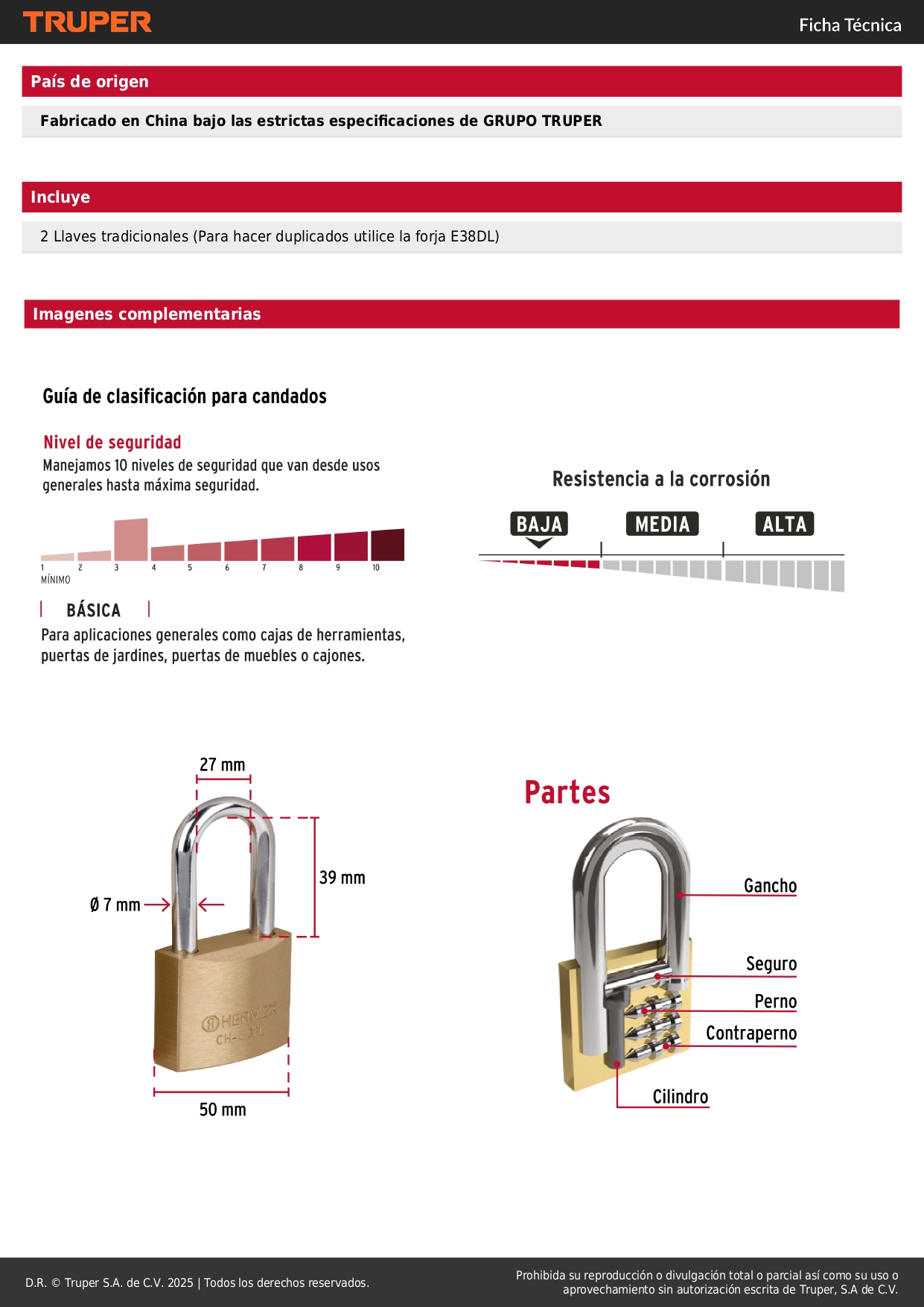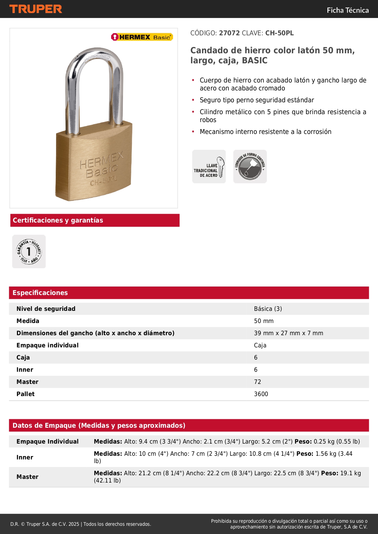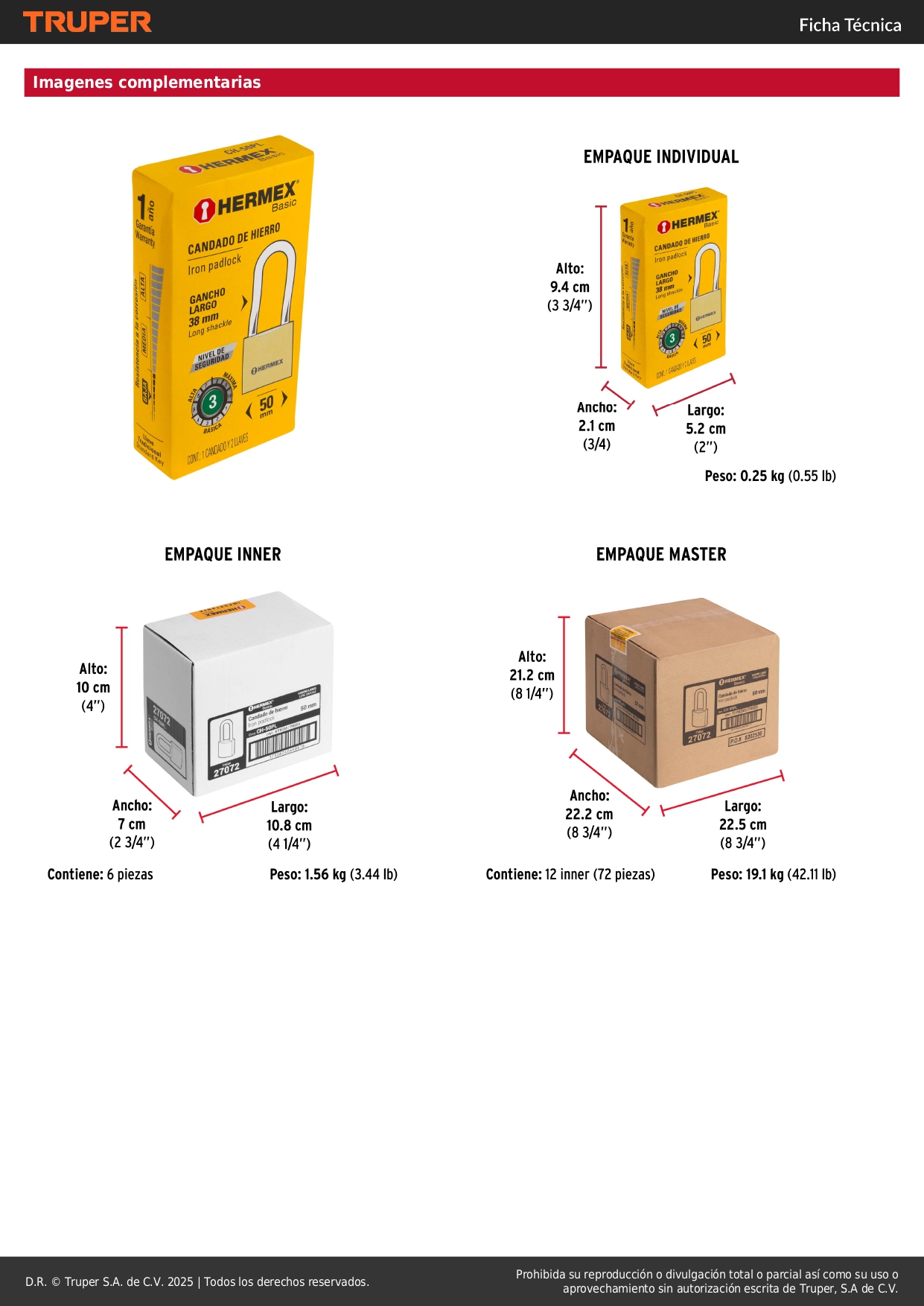 Candado de hierro color latón 50 mm arco largo, caja, basic hermex