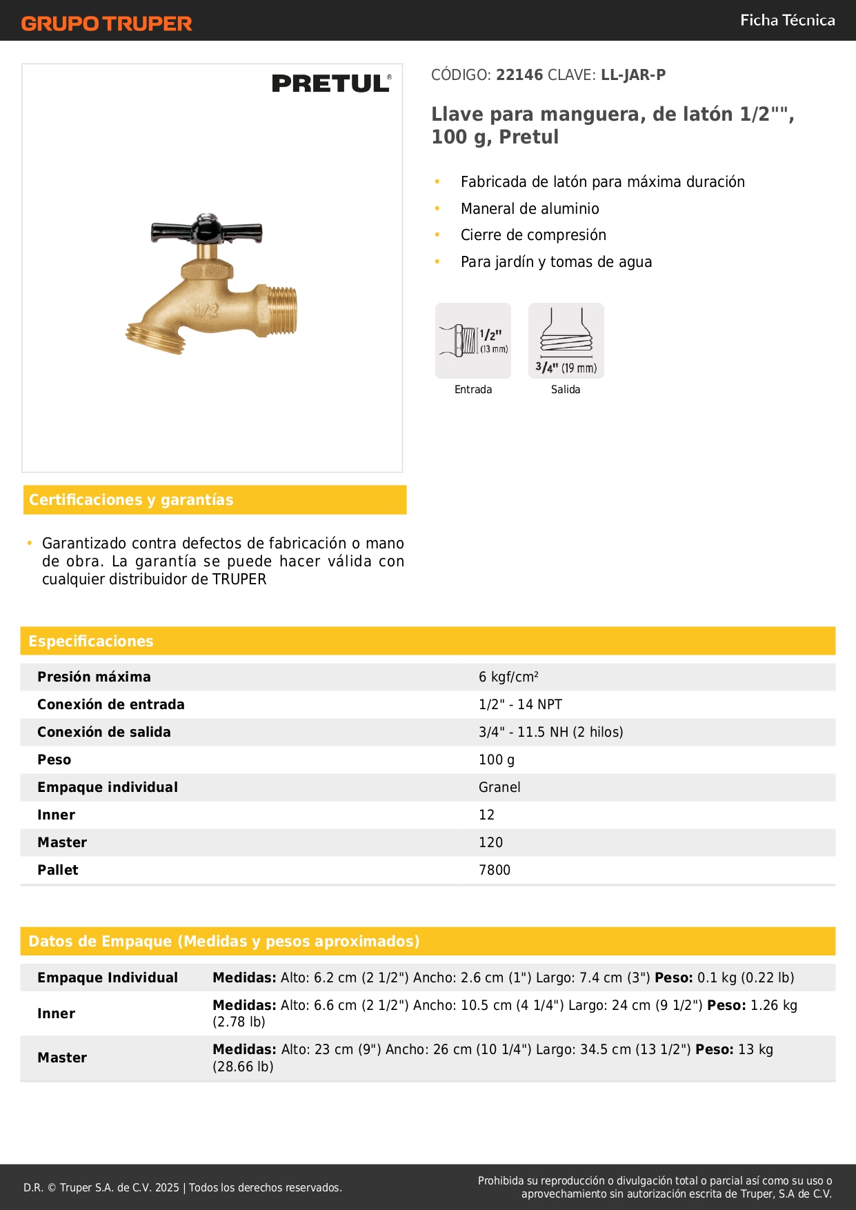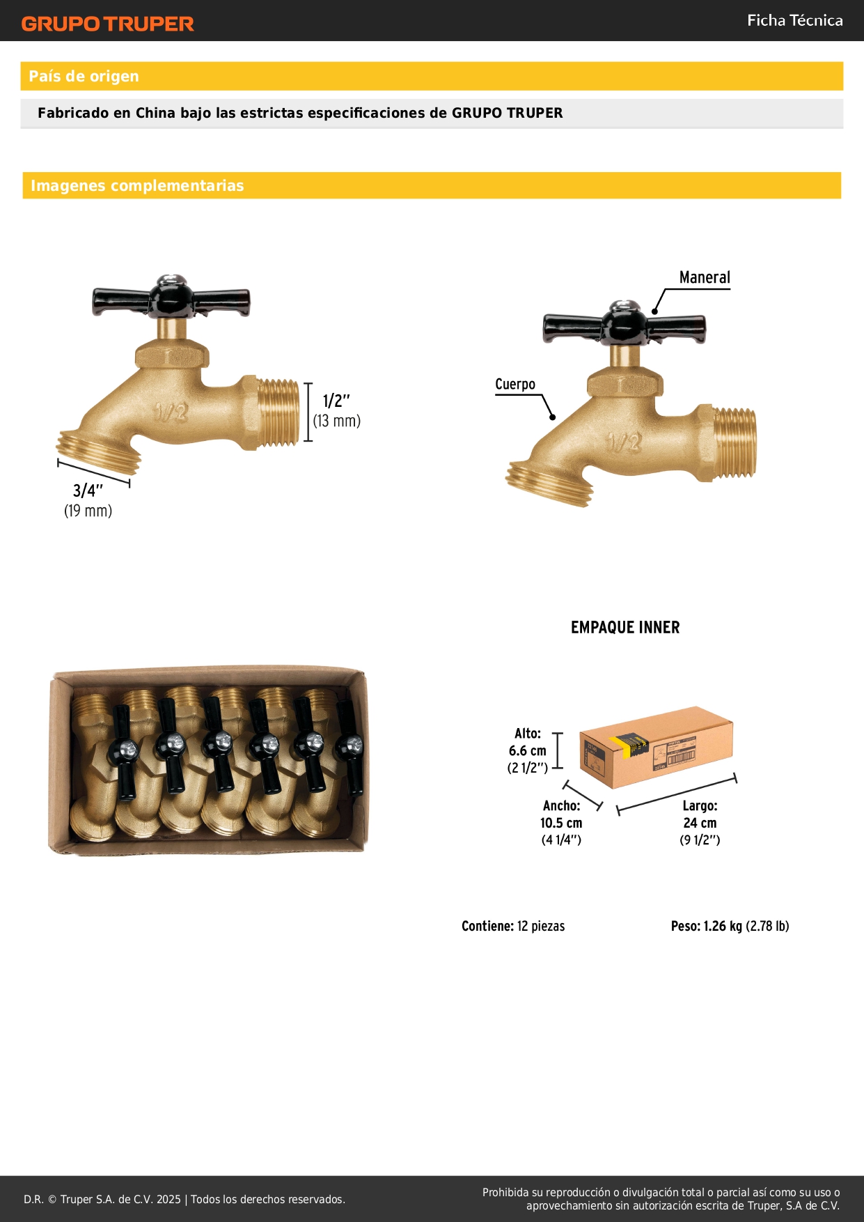Caño de latón 1/2´´ para jardín, 100 g, a granel, pretul S/ 9.50 Agregar al carro Avísame cuando llegue -Fabricada de latón para máxima duración-Maneral de aluminio-Cierre de compresión-Para jardín y tomas de agua