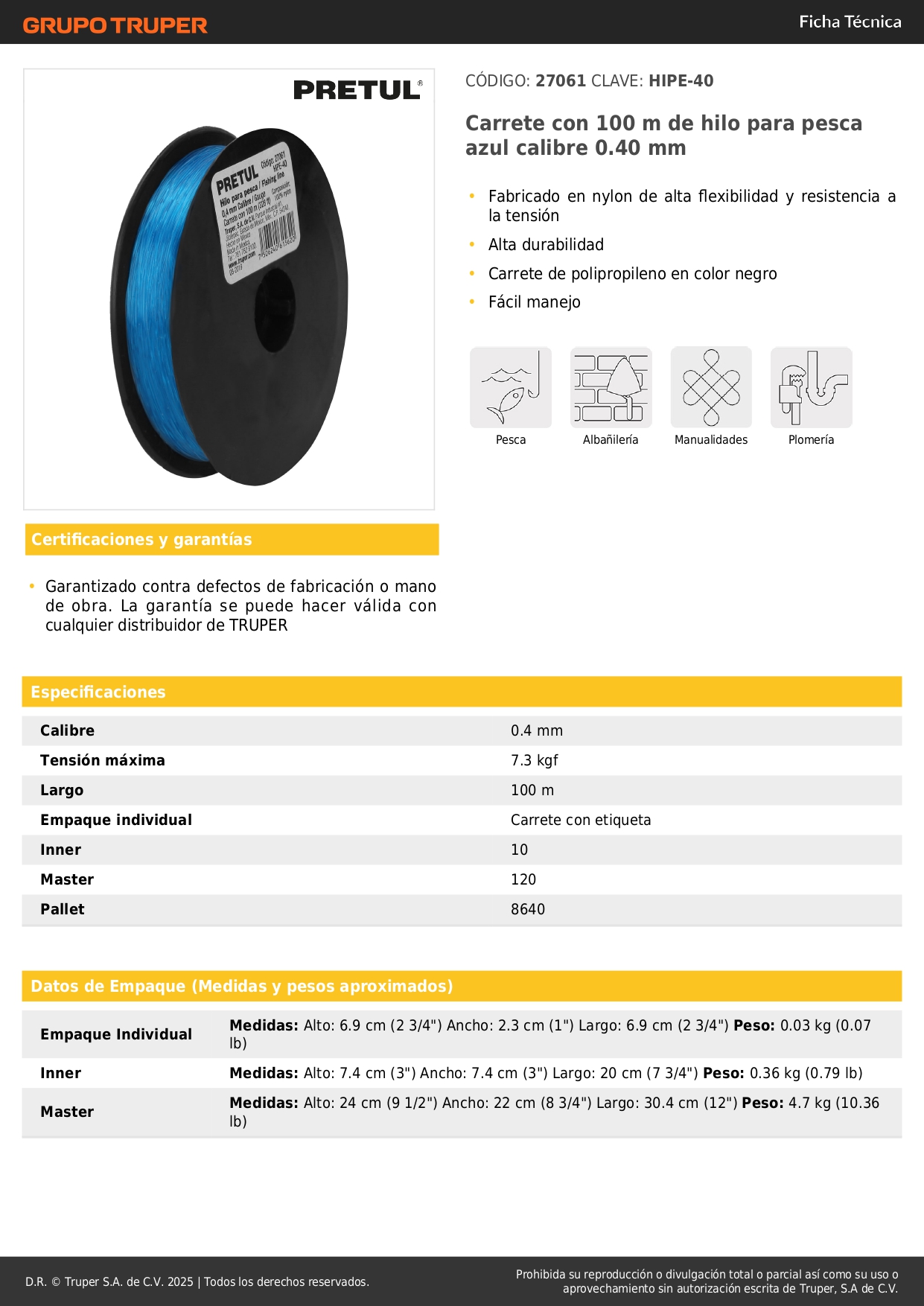 Carrete con 100 m de hilo para pesca azul calibre 0.40 mm pretul S/ 2.00 Agregar al carro Avísame cuando llegue -Fabricado en nylon de alta flexibilidad y resistencia a la tensión-Alta durabilidad-Carrete de polipropileno en color negro-Fácil manejo