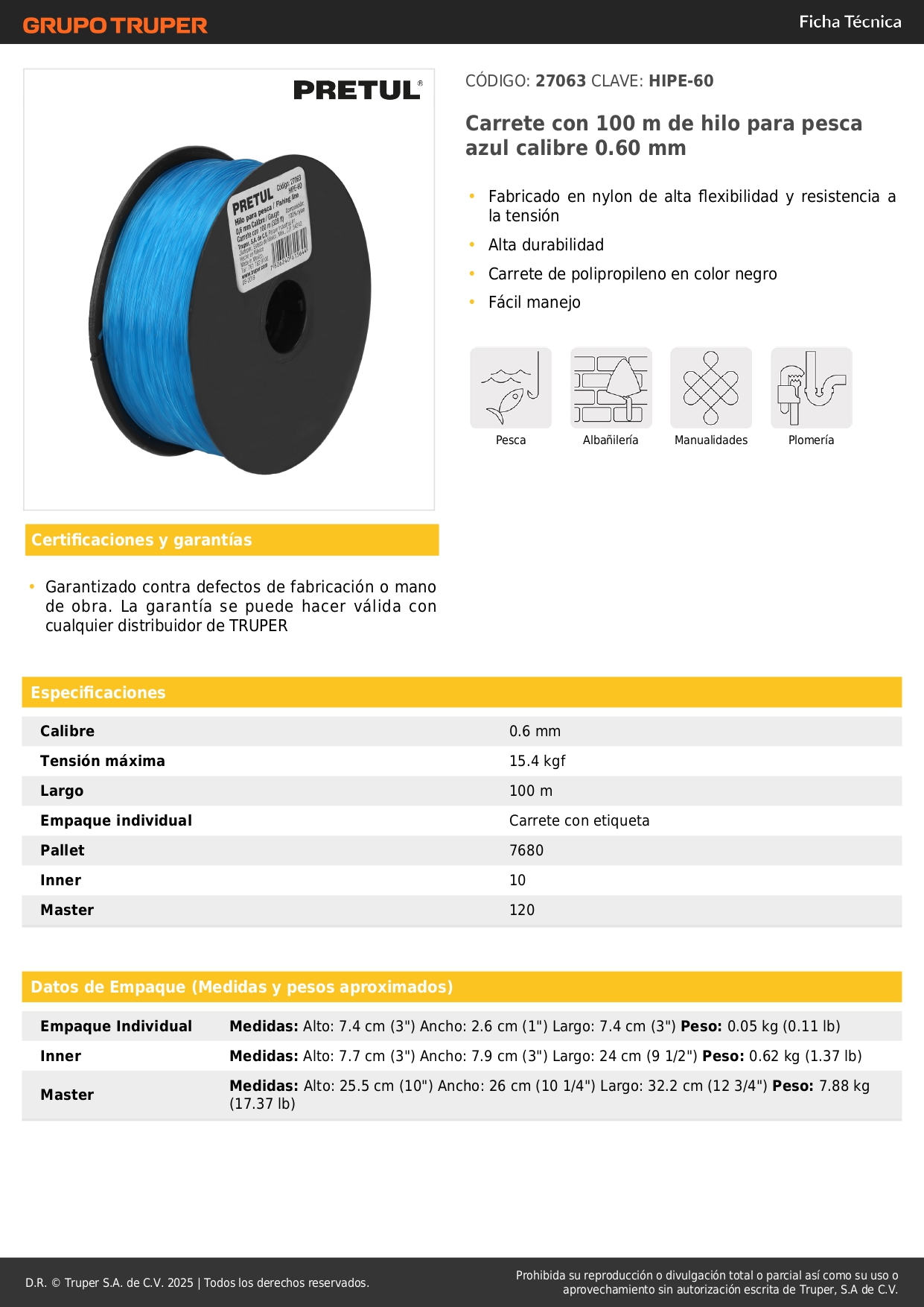 Carrete con 100 m de hilo para pesca azul calibre 0.60 mm pretul S/ 3.70 Agregar al carro Avísame cuando llegue -Fabricado en nylon de alta flexibilidad y resistencia a la tensión-Alta durabilidad-Carrete de polipropileno en color negro-Fácil manejo