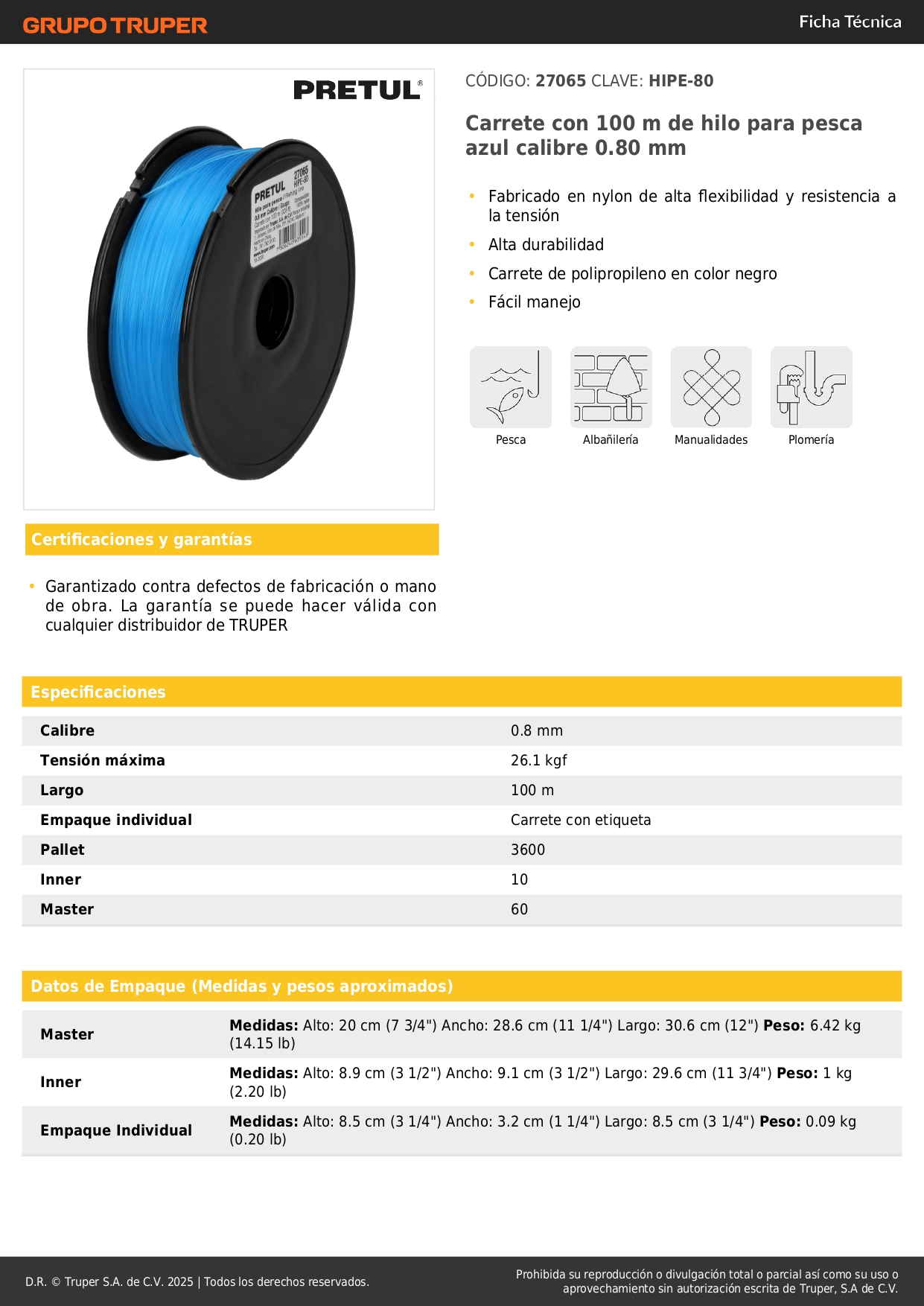 Carrete con 100 m de hilo para pesca azul calibre 0.80 mm pretul S/ 5.80 Agregar al carro Avísame cuando llegue -Fabricado en nylon de alta flexibilidad y resistencia a la tensión-Alta durabilidad-Carrete de polipropileno en color negro-Fácil manejo