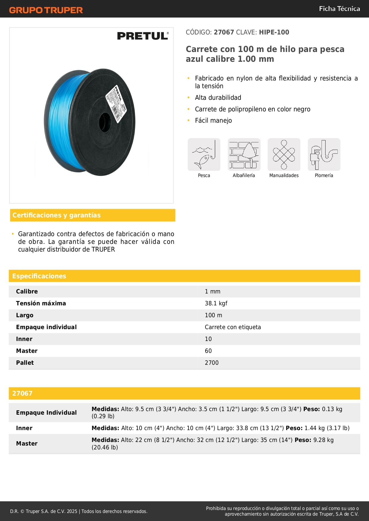 Carrete con 100 m de hilo para pesca azul calibre 1.00 mm pretul S/ 7.00 Agregar al carro Avísame cuando llegue -Fabricado en nylon de alta flexibilidad y resistencia a la tensión-Alta durabilidad-Carrete de polipropileno en color negro-Fácil manejo